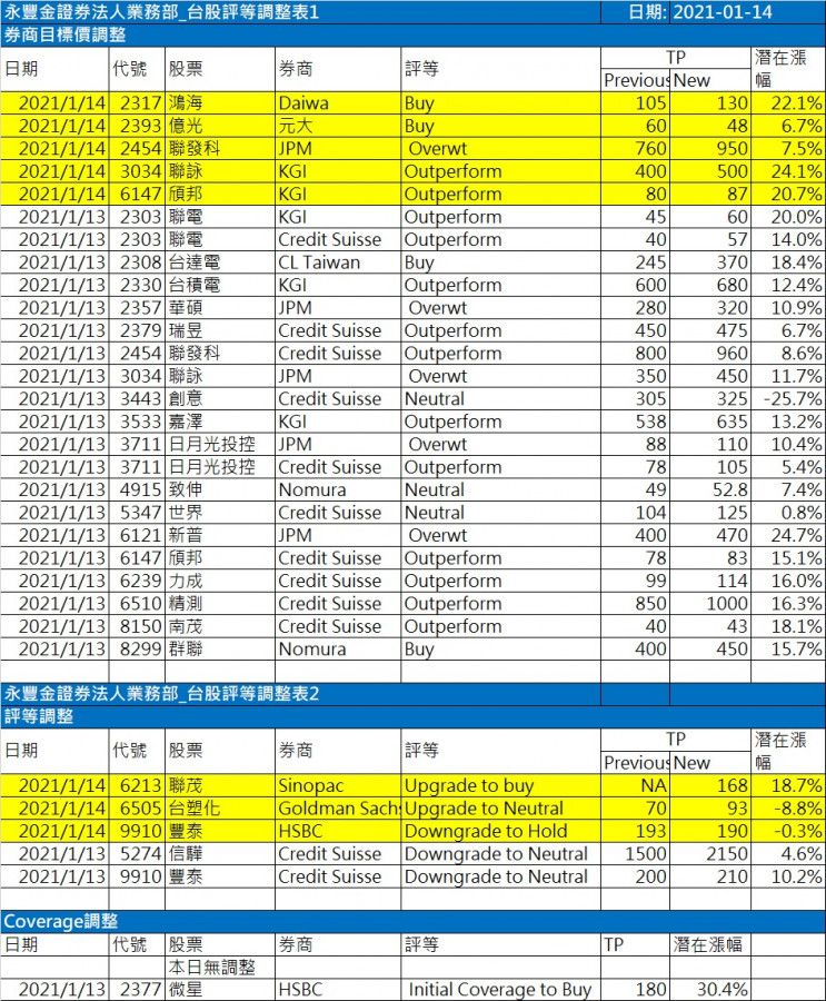 友達日前公布12月營收288.6億元(+11.2% MoM,+39.3% YoY),整體4Q20營收805.4億元,優於研究處前次報告預估之784.6億元。研究處持續看好面板業1H21動能,主因(1) 2020年底電視銷售強勁,業者庫存持續維持低水位,為確保電視面板庫存,加上IT面板持續排擠TV面板產出,TV面板報價續揚,(2) 面板業者的生產成本上升,以及玻璃基板事件可能影響第一季面板廠產能規劃,有利於面板廠議價能力,(3)長期而言,韓國業者(三星、LGD)退出,中國業者整併且補助減少,即使因疫情帶動的需求結束後,研究處預期面板產業仍可維持秩序;友達1Q21出貨表現將淡季不淡,備貨力道可延續至3Q21,由於產能利用率維持高檔,將有利於其毛利率及營利率跳升,維持買進建議,目標價16元(0.8 X 2021 BVPS 20元)。
