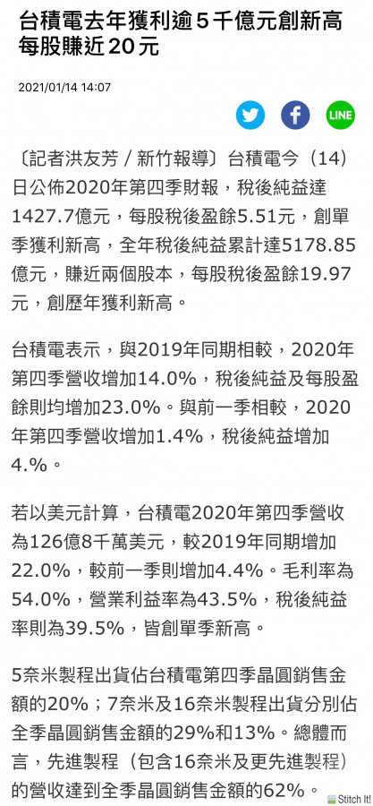 台積電公布去年自結財報!Q4每股大賺5.51元 全年賺近2股本