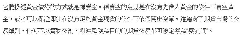 它們操縱黃金價格的方式就是裸賣空。裸賣空的意思是在沒有先借入黃金的條件下賣空黃金,或者可以保證即使在沒有足夠黃金現貨的條件下依然開出空單。這違背了期貨市場的交易準則,任何不以實物交割、對沖風險為目的的期貨交易都可被定義為“耍流氓”。