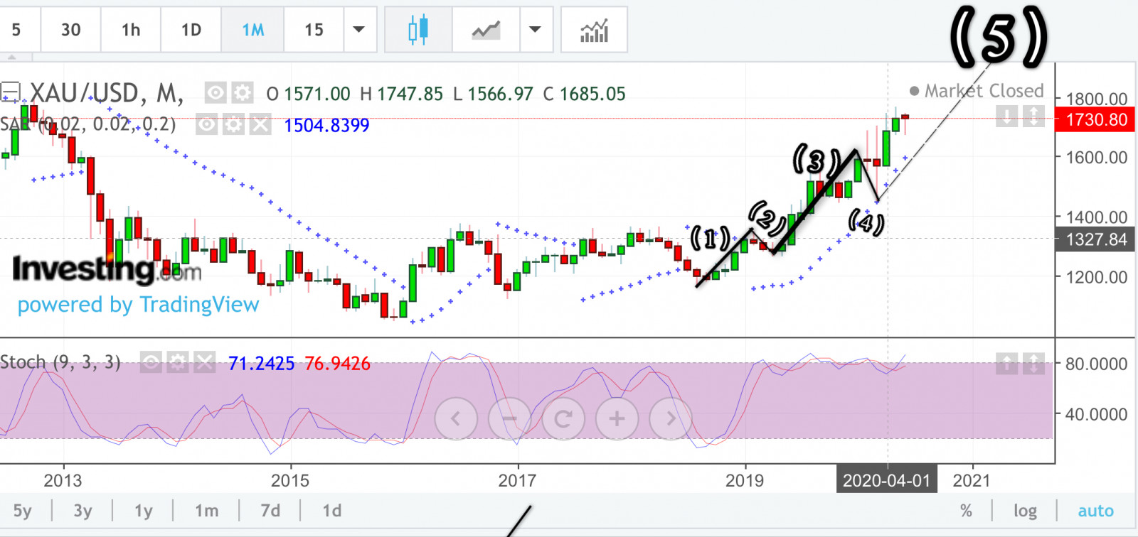 那麼(2015~2018)這段期間在技術分析上應該說是底部盤整期(3年),而在波段計算過程中不是從底部盤整期間的最底點計算,而是從正式突破60月均線並且均線翻揚(2018/12/01/$1276)開始計算為波段起漲點(1)。