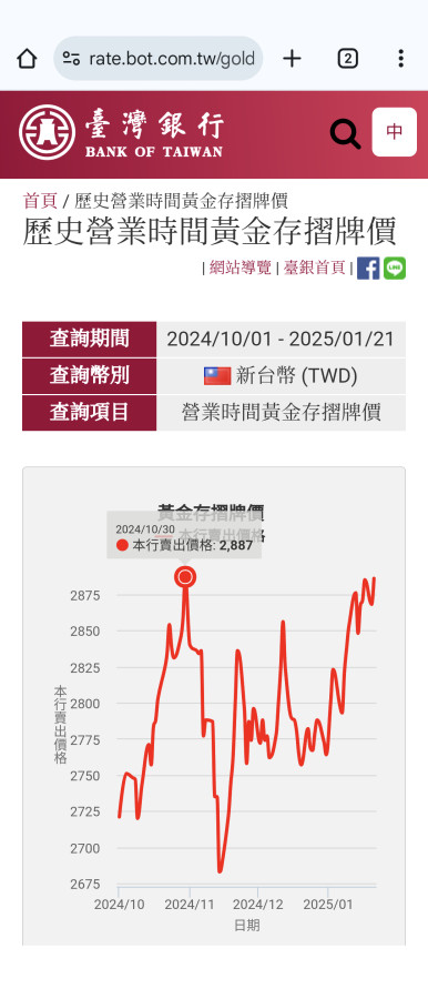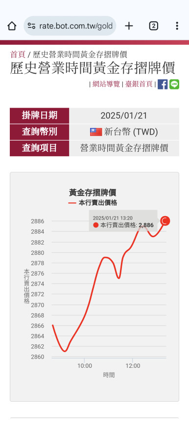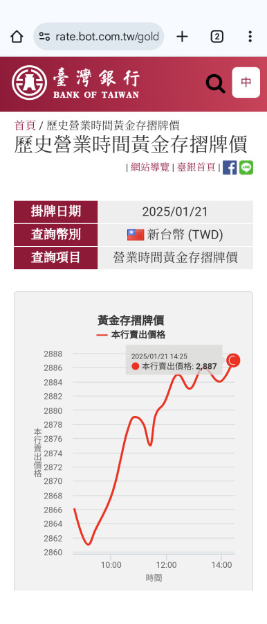 今天挑戰歷史最高2887,到現在為止2886,台灣銀行公佈台幣計價黃金🤭