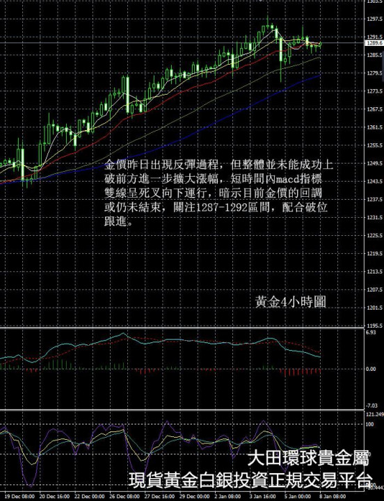 從現貨黃金4小時圖看,金價昨日出現反彈過程,但整體並未能成功上破前方進一步擴大漲幅,短時間內macd指標雙線呈死叉向下運行,暗示目前金價的回調或仍未結束,關注1287-1292區間,配合破位跟進。