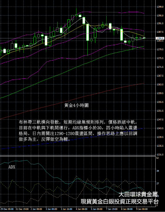 從現貨黃金4小時圖看,布林帶三軌橫向發散,短期均線無規則排列,價格跌破中軌,目前在中軌與下軌間運行,ADX指標小於30,四小時陷入震盪格局。日內需關注1290-1280震盪區間,操作思路上應以回檔做多為主,反彈做空為輔。