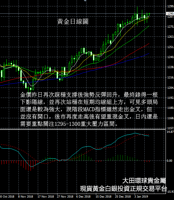 從現貨黃金日線圖看,金價昨日再次踩穩支撐後強勢反彈回升,最終錄得一根下影陽線,並再次站穩在短期均線組上方,可見多頭局面還是較為強大,現階段MACD指標雖然走出金叉,但並沒有開口,後市再度走高後有望重現金叉,日內還是需要重點關注1295-1300重大壓力區間。