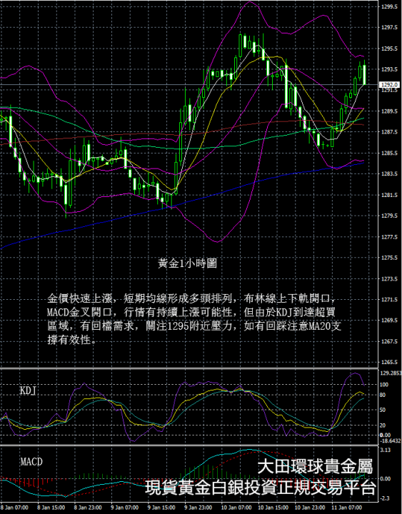從現貨黃金1小時圖看,金價快速上漲,短期均線形成多頭排列,布林線上下軌開口,MACD金叉開口,行情有持續上漲可能性,但由於KDJ到達超買區域,有回檔需求,關注1295附近壓力,如有回踩注意MA20支撐有效性。