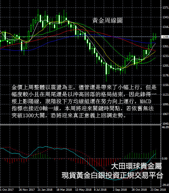 從現貨黃金周線圖看,金價上周整體以震盪為主,儘管還是帶來了小幅上行,但是幅度較小且在周尾還是以沖高回落的格局結束,因此錄得一根上影陽線,現階段下方均線組還在努力向上運行,MACD指標也接近0軸一線,本周將迎來關鍵時間點,若依舊無法突破1300大關,恐將迎來真正意義上回調走勢。