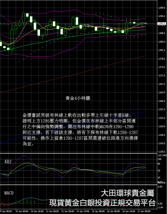從現貨黃金4小時圖看,金價嘗試突破布林線上軌收出較多帶上引線十字星K線,證明上方1295壓力明顯,但金價在布林線上半部分區間運行之中偏向強勢調整,關注布林線中軌MA20在1291-1290附近支撐,若下破該支撐,將有下探布林線下軌1288-1287可能性,操作上留意1295-1287區間震盪破位跟進方向選擇為宜。