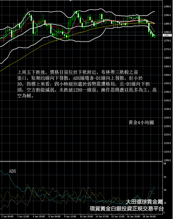從現貨黃金4小時圖看,上週五下跌後,價格目前位於下軌附近,布林帶三軌較之前張口,短期均線向下發散,ADX線隨著-DI線向上發散,但小於30,指標上來看,四小時級別處於弱勢震盪格局,且-DI線向下拐頭,空方動能減弱,未跌破1280一線前,操作思路應以低多為主,高空為輔。