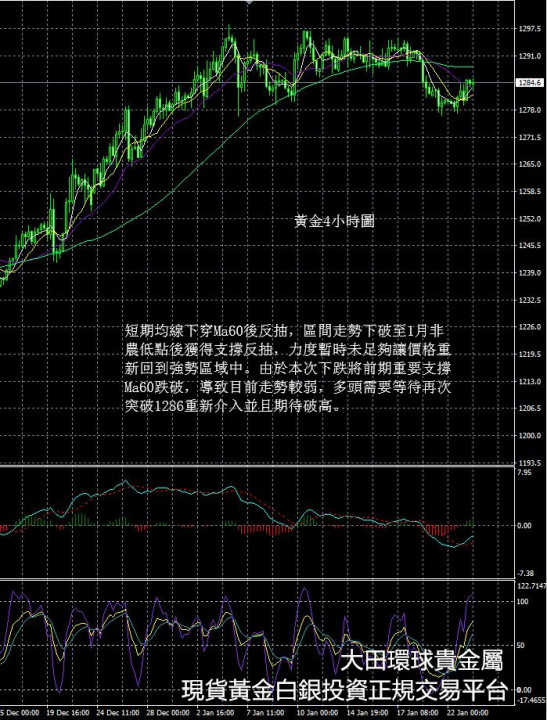 從現貨黃金4小時圖看,短期均線下穿Ma60後反抽,區間走勢下破至1月非農低點後獲得支撐反抽,力度暫時未足夠讓價格重新回到強勢區域中。由於本次下跌將前期重要支撐Ma60跌破,導致目前走勢較弱,多頭需要等待再次突破1286重新介入並且期待破高。