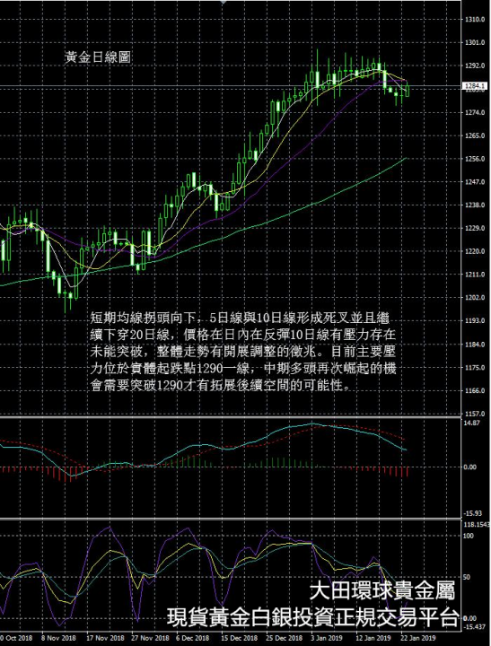 從現貨黃金日線圖看,短期均線拐頭向下,5日線與10日線形成死叉並且繼續下穿20日線,價格在日內在反彈10日線有壓力存在未能突破,整體走勢有開展調整的徵兆。目前主要壓力位於實體起跌點1290一線,中期多頭再次崛起的機會需要突破1290才有拓展後續空間的可能性。