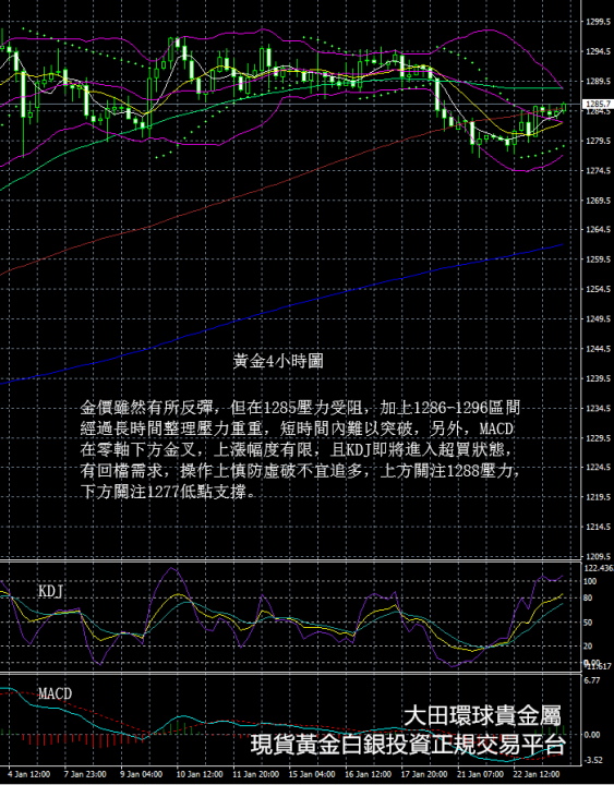 從現貨黃金4小時圖看,金價雖然有所反彈,但在1285壓力受阻,加上1286-1296區間經過長時間整理壓力重重,短時間內難以突破,另外,MACD在零軸下方金叉,上漲幅度有限,且KDJ即將進入超買狀態,有回檔需求,操作上慎防虛破不宜追多,上方關注1288壓力,下方關注1277低點支撐。