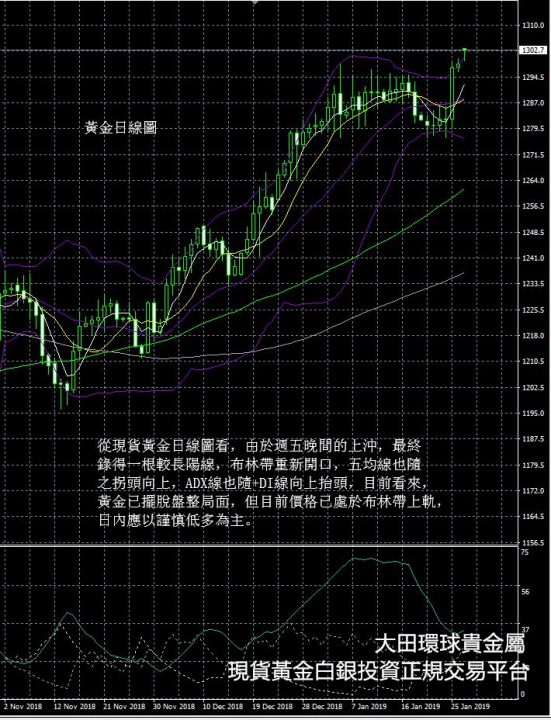 從現貨黃金日線圖看,由於週五晚間的上沖,最終錄得一根較長陽線,布林帶重新開口,五均線也隨之拐頭向上,ADX線也隨+DI線向上抬頭,目前看來,黃金已擺脫盤整局面,但目前價格已處於布林帶上軌,日內應以謹慎低多為主。