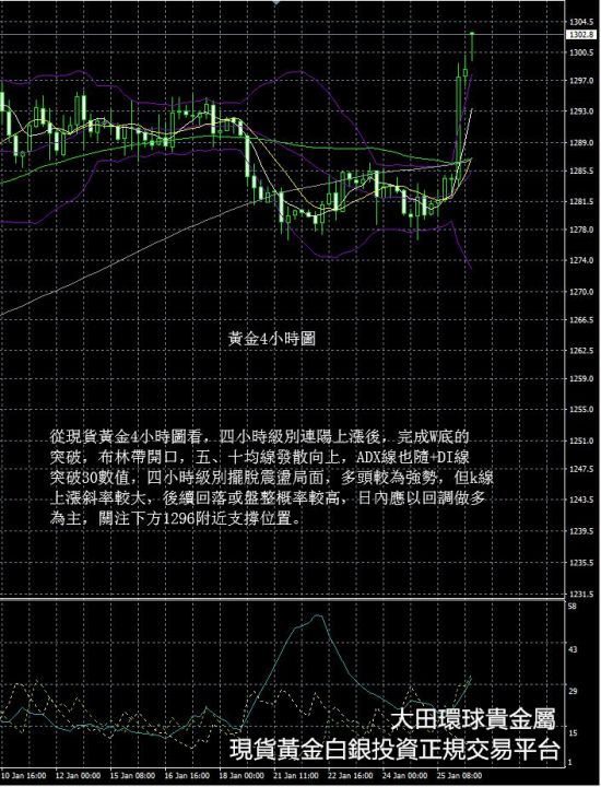 從現貨黃金4小時圖看,四小時級別連陽上漲後,完成W底的突破,布林帶開口,五、十均線發散向上,ADX線也隨+DI線突破30數值,四小時級別擺脫震盪局面,多頭較為強勢,但k線上漲斜率較大,後續回落或盤整概率較高,日內應以回調做多為主,關注下方1296附近支撐位置。