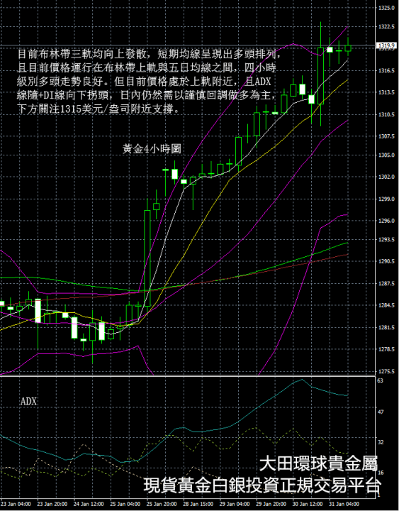 從現貨黃金4小時圖看,目前布林帶三軌均向上發散,短期均線呈現出多頭排列,且目前價格運行在布林帶上軌與五日均線之間,四小時級別多頭走勢良好。但目前價格處於上軌附近,且ADX線隨+DI線向下拐頭,日內仍然需以謹慎回檔做多為主,下方關注1315美元/盎司附近支撐。