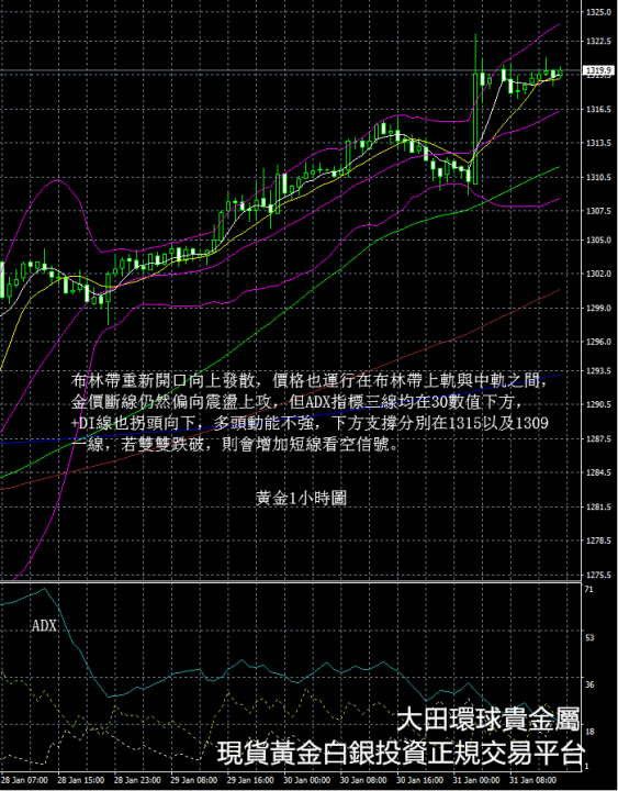 從現貨黃金1小時圖看,布林帶重新開口向上發散,價格也運行在布林帶上軌與中軌之間,金價斷線仍然偏向震盪上攻,但ADX指標三線均在30數值下方,+DI線也拐頭向下,多頭動能不強,下方支撐分別在1315以及1309一線,若雙雙跌破,則會增加短線看空信號。
