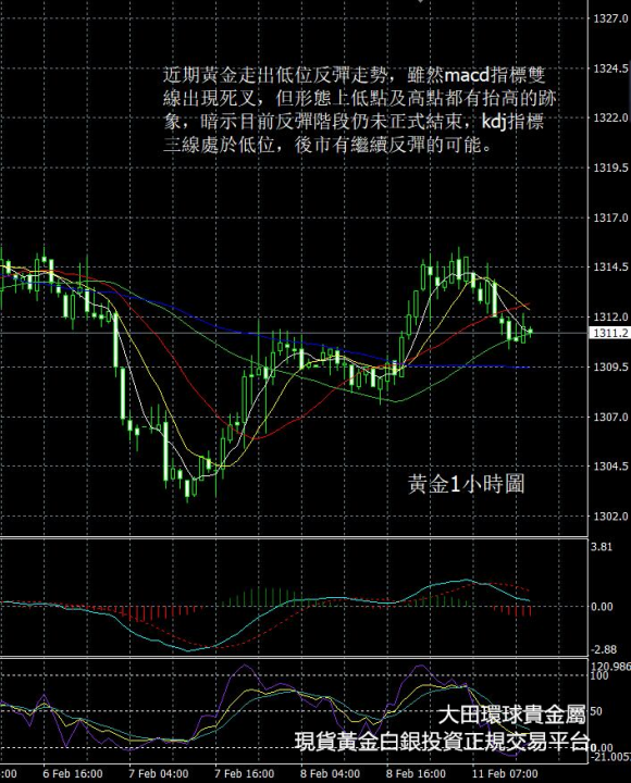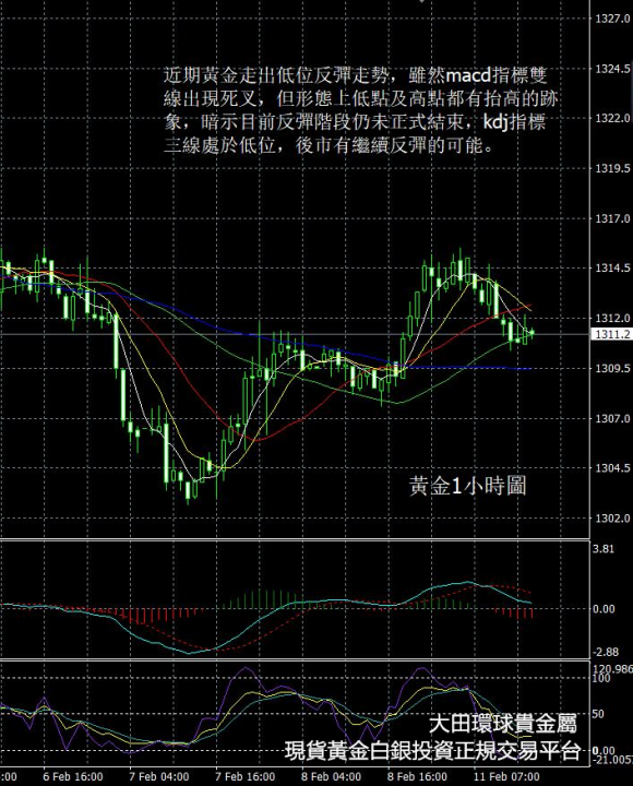 從現貨黃金1小時圖看, 近期黃金走出低位反彈走勢,雖然macd指標雙線出現死叉,但形態上低點及高點都有抬高的跡象,暗示目前反彈階段仍未正式結束,kdj指標三線處於低位,後市有繼續反彈的可能。