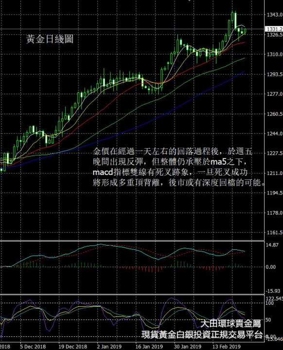 從現貨黃金日線圖看,金價在經過一天左右的回落過程後,於週五晚間出現反彈,但整體仍承壓於ma5之下,macd指標雙線有死叉跡象,一旦死叉成功將形成多重頂背離,後市或有深度回檔的可能。