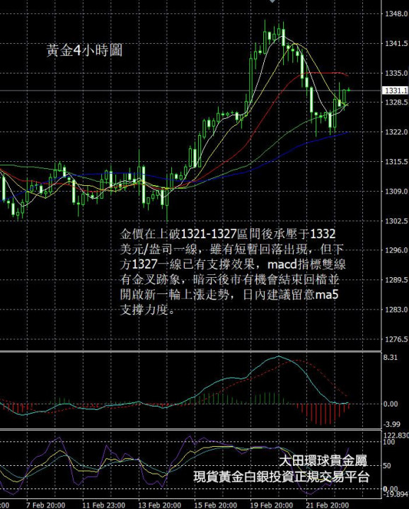從現貨黃金4小時圖看,金價在上破1321-1327區間後承壓于1332美元/盎司一線,雖有短暫回落出現,但下方1327一線已有支撐效果,macd指標雙線有金叉跡象,暗示後市有機會結束回檔並開啟新一輪上漲走勢,日內建議留意ma5支撐力度。