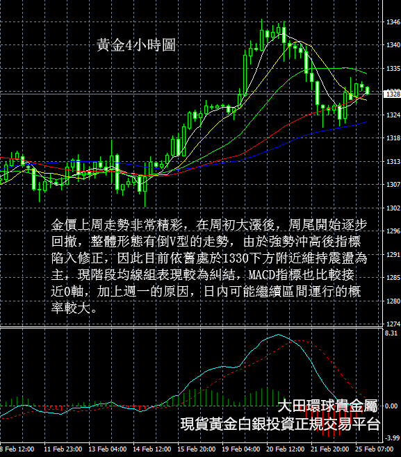 從現貨黃金4小時圖看,金價上周走勢非常精彩,在周初大漲後,周尾開始逐步回撤,整體形態有倒V型的走勢,由於強勢沖高後指標陷入修正,因此目前依舊處於1330下方附近維持震盪為主,現階段均線組表現較為糾結,MACD指標也比較接近0軸,加上週一的原因,日內可能繼續區間運行的概率較大。
