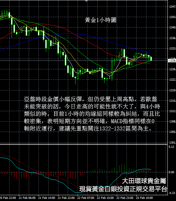 從現貨黃金1小時圖看,亞盤時段金價小幅反彈,但仍受壓上周高點,若歐盤未能突破的話,今日走高的可能性就不大了,與4小時類似的時,目前1小時的均線組同樣較為糾結,而且比較密集,表明短期方向並不明確,MACD指標同樣在0軸附近運行,建議先重點關注1322-1332區間為主。
