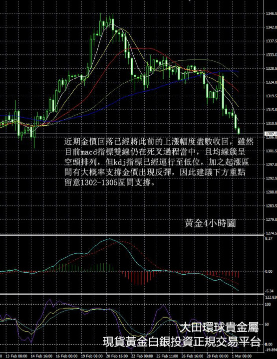 從現貨黃金4小時圖看,近期金價回落已經將此前的上漲幅度盡數收回,雖然目前macd指標雙線仍在死叉過程當中,且均線簇呈空頭排列,但kdj指標已經運行至低位,加之起漲區間有大概率支撐金價出現反彈,因此建議下方重點留意1302-1305區間支撐。