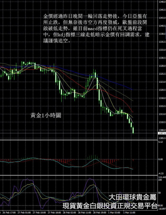 從現貨黃金1小時圖看,金價經過昨日晚間一輪回落走勢後,今日亞盤有所止跌,但無奈後市空方再度發威,歐盤前段開啟破低走勢,雖目前macd指標仍在死叉過程當中,但kdj指標三線走低暗示金價有回調需求,建議謹慎追空。