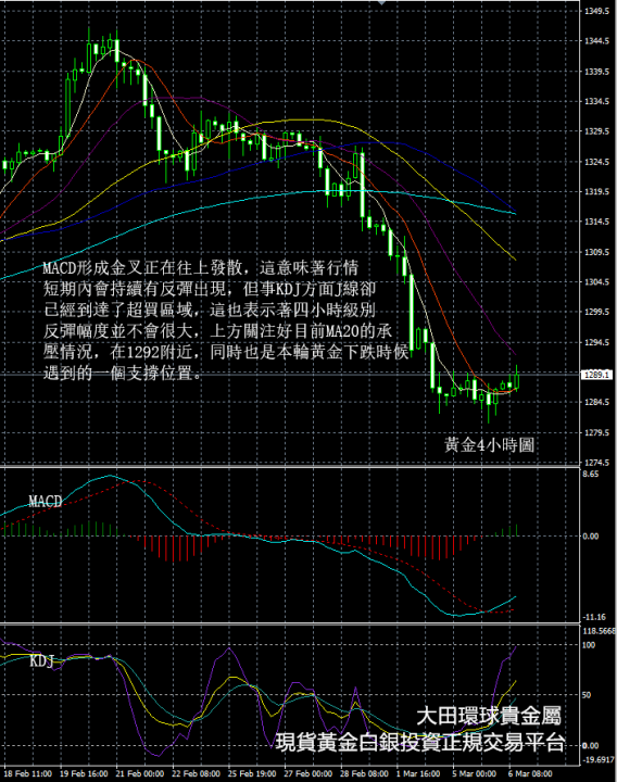 從現貨黃金4小時圖看,MACD形成金叉正在往上發散,這意味著行情短期內會持續有反彈出現,但事KDJ方面J線卻已經到達了超買區域,這也表示著四小時級別反彈幅度並不會很大,上方關注好目前MA20的承壓情況,在1292附近,同時也是本輪黃金下跌時候遇到的一個支撐位置。