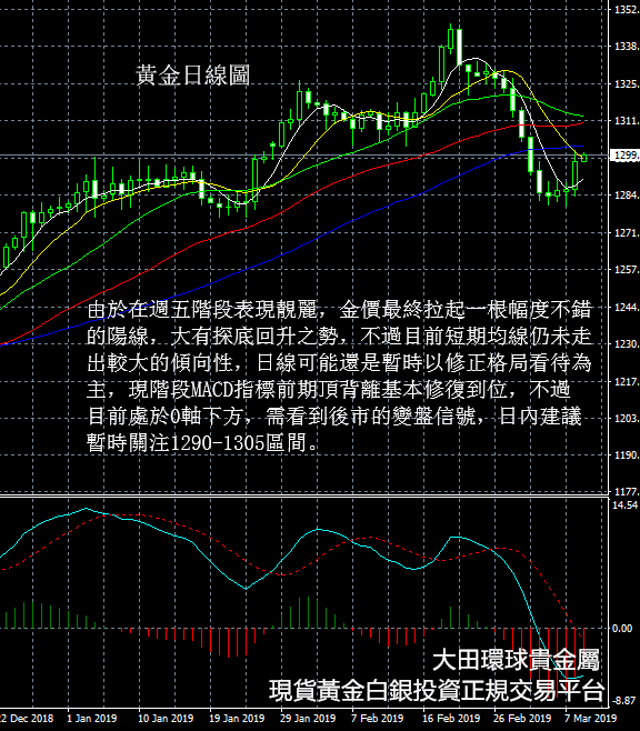 從現貨黃金日線圖看,由於在週五階段表現靚麗,金價最終拉起一根幅度不錯的陽線,大有探底回升之勢,不過目前短期均線仍未走出較大的傾向性,日線可能還是暫時以修正格局看待為主,現階段MACD指標前期頂背離基本修復到位,不過目前處於0軸下方,需看到後市的變盤信號,日內建議暫時關注1290-1305區間。