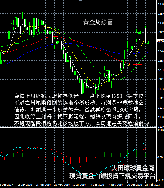 從現貨黃金周線圖看,金價上周周初表現較為低迷,一度下探至1280一線支撐,不過在周尾階段開始逐漸企穩反撲,特別是非農數據公佈後,多頭進一步延續攀升,嘗試再度衝擊1300大關,因此收線上錄得一根下影陽線,總體表現為探底回升,不過現階段價格仍處於均線下方,本周還是需要謹慎對待。