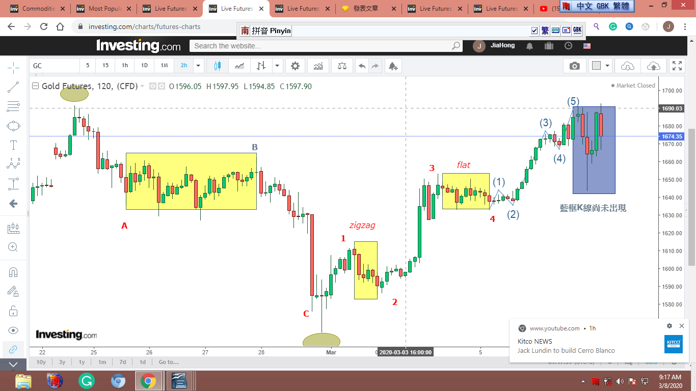 金子2-24從$1691.55的高點,一路跌下來。用完美的ABC波,而且,B波是個flat,flat通常是倒數第二波,上行是第四波,下行就是B波。C波走到2-29,金子止跌反彈(反轉時用的是一招“長腳十字星”,但這不在愛氏理論裡!)