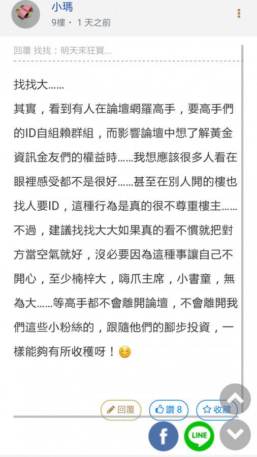 不過這論壇除了那少數幾個人外,基本上還是很多善良的人,主席,楠梓大,薇,施思思大,全職媽媽,小瓜呆,蘇菲大,無心大,天命大……還有很多沒提到的大大,這麼多心地善良的人在,不論有沒有提供專業分析,但至少大家都聊得很開心,不會互相傷害,不會挑釁,在討論區閒聊感覺就很不錯!😊