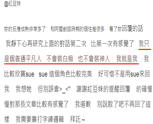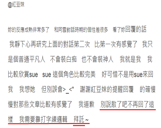 稱 Sue 是覺者 , 自己還可點評 Sue 太過理想
