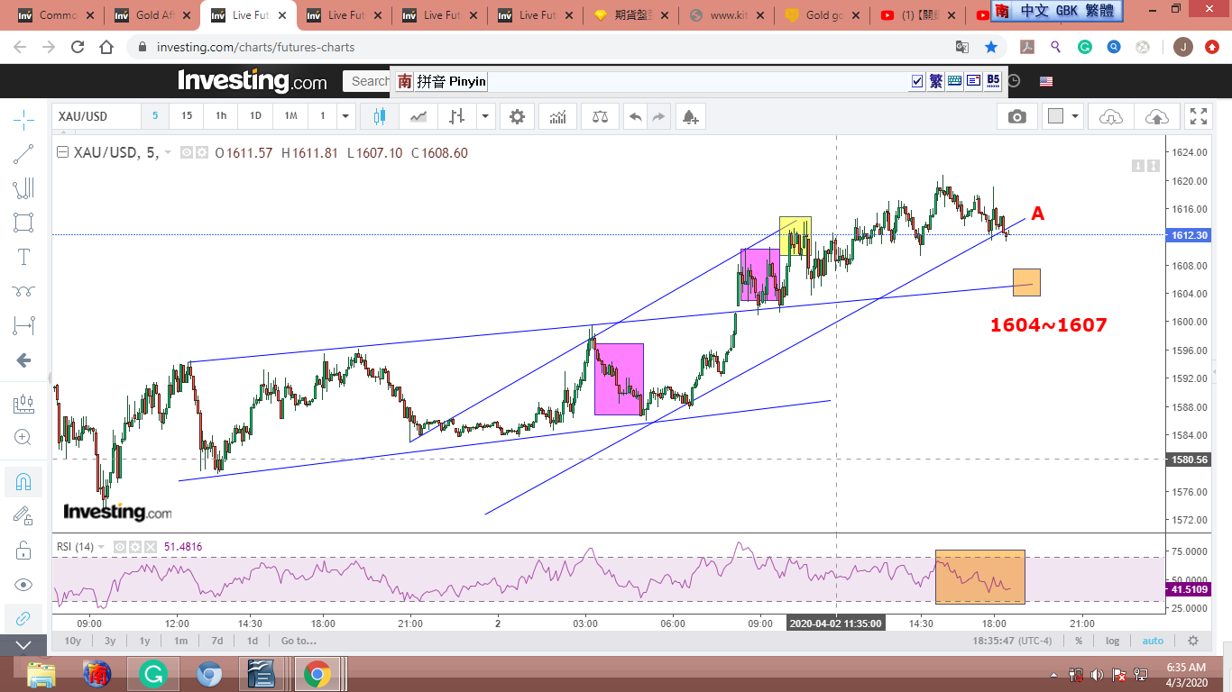 現貨如果守不住A線,可能會回測 1604~1607。指標似乎快要見底,應該不回巨幅拉回。