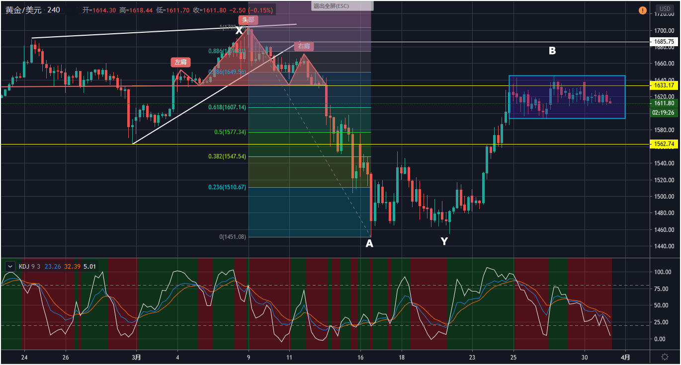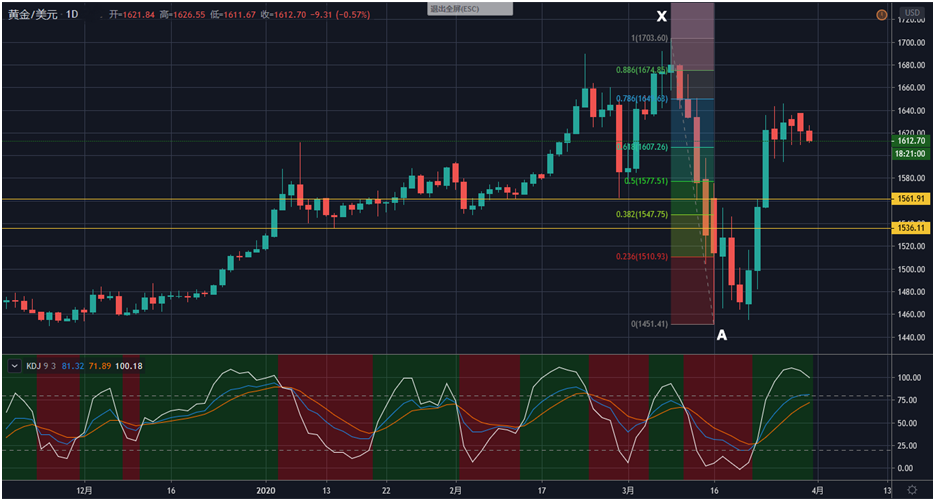 黃金的日線圖表形態顯示,價格連續四個交易日陷入高位整理,反彈受阻於0.786XA水平,其中X為3月9月高點1703.6,A為3月16日低點1451。同時,KDJ指標進入超買區,引發了更多回落調整需求。
