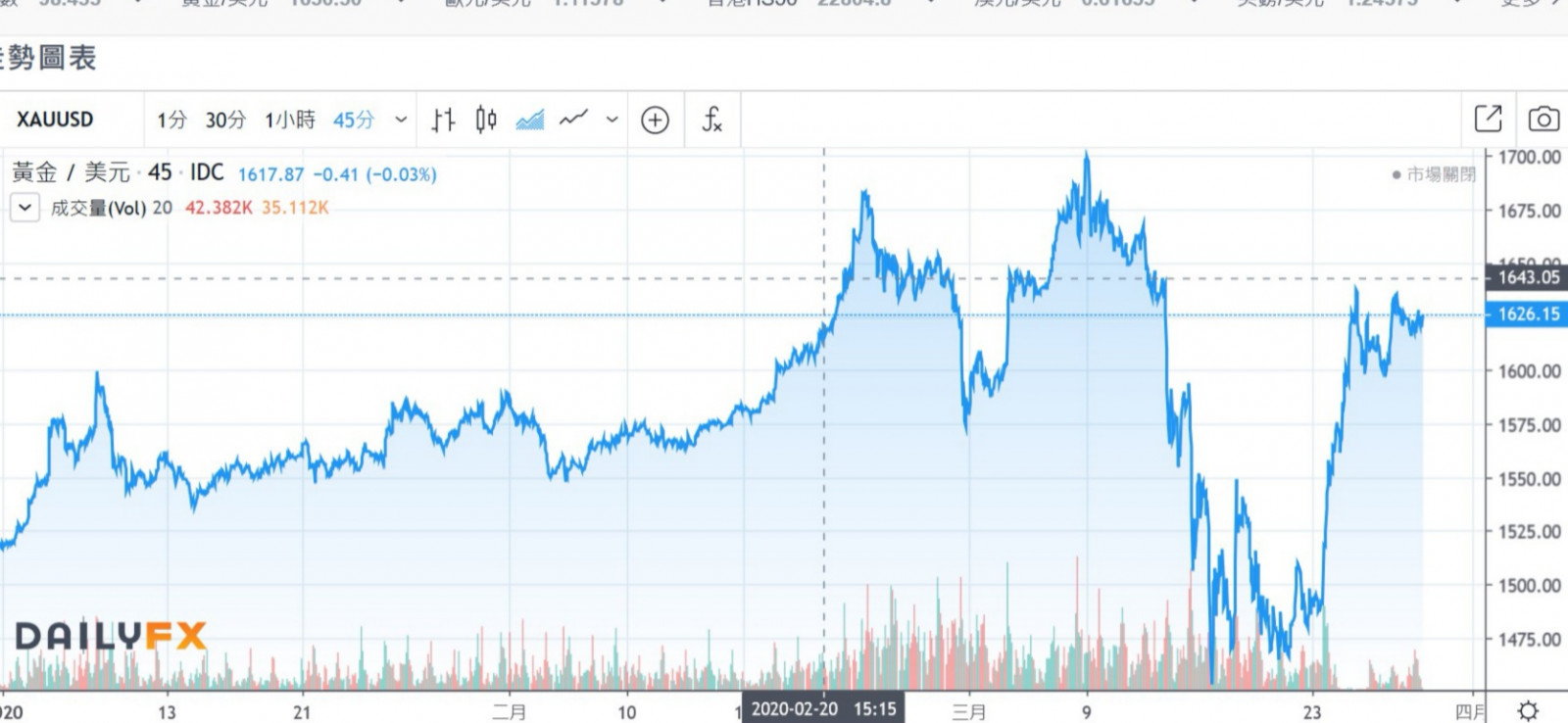 期貨金價現時在每安士1,620至1,675美元之間高位整固,相信短期市場將對無限購債的憧憬逐漸消化,加上通脹率短期難以飆升,甚至環球可能將陷入通縮的危機下,金價將難以突破1,700美元。現時金價下方較大支持仍在1,620美元,當市場消化中央銀行措施的刺激後,金價將可能再回落至1,560美元才見支持。