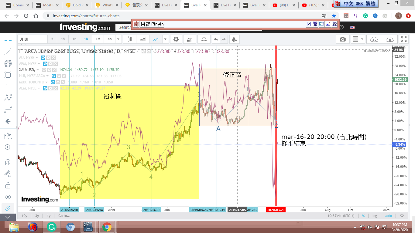 1) Mar-16-20 附近 (台北時間): 黃色衝刺波 修正結束