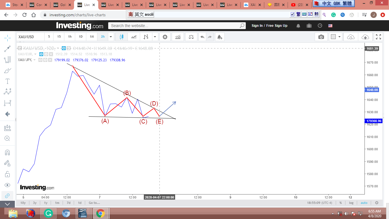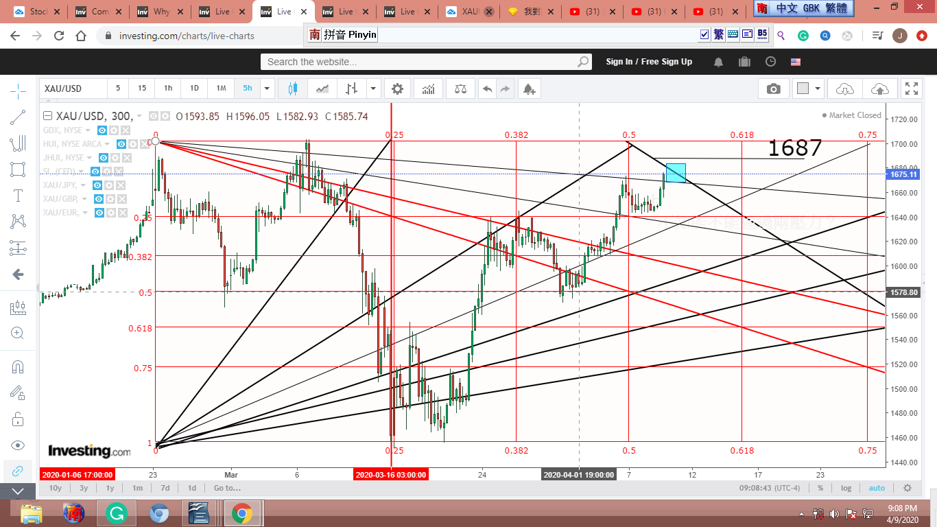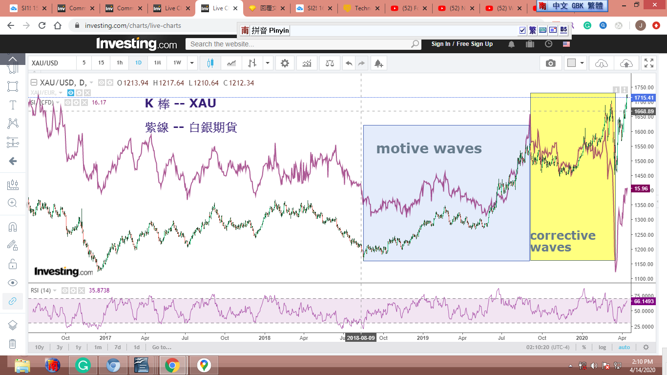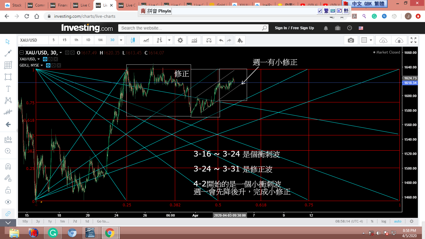從去年9月起,世界動亂不已,金價受衝擊,圖形扭曲變形,零亂不堪。我參考反應較慢的金股,覺得從9-10-2018到3-13-2020,金子走完了一個完整的12345-ABC衝刺/修正波。[我只貼出一張圖,有興趣的可以拿各種金股或黃金共同基金多加對照。]