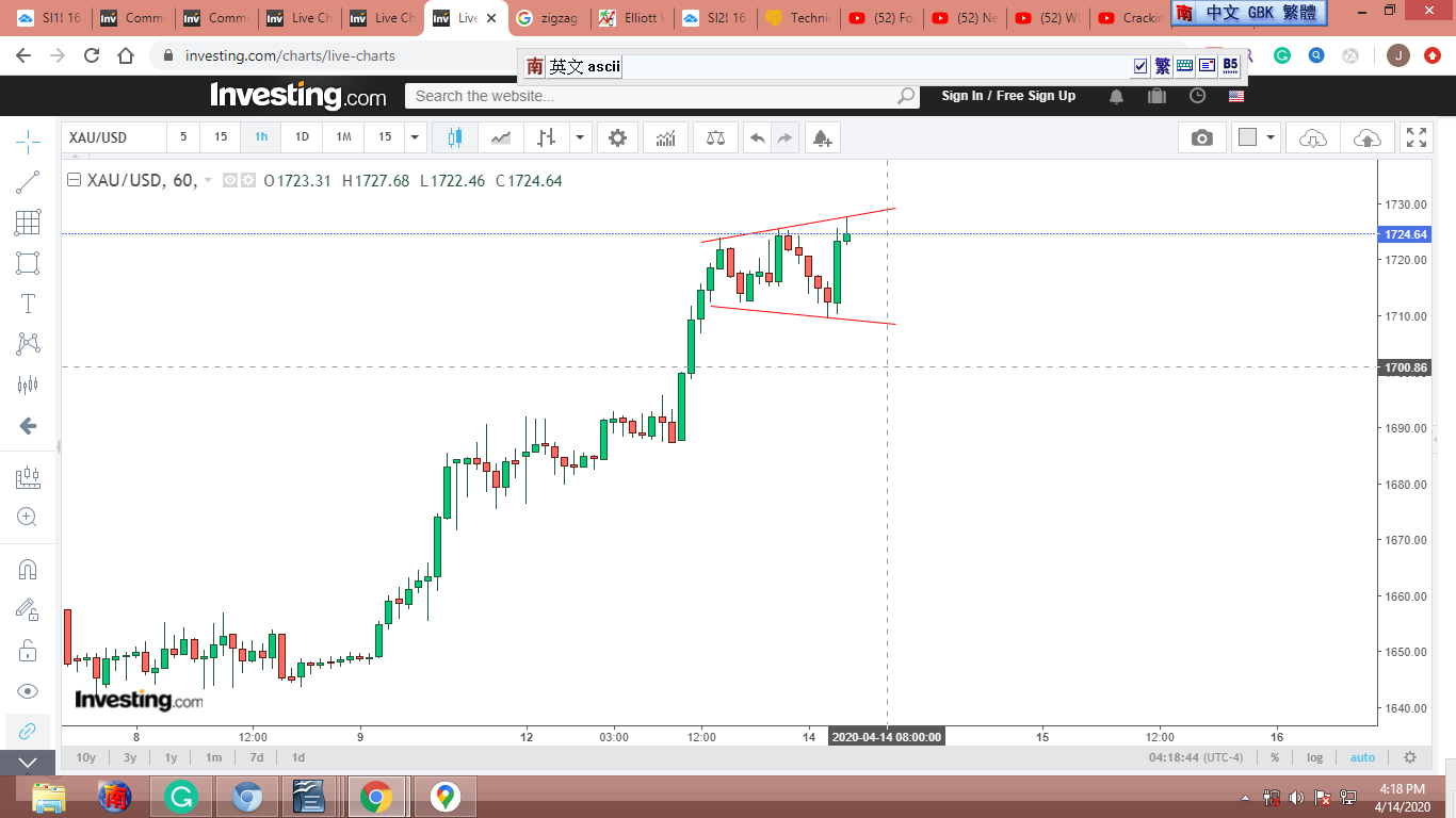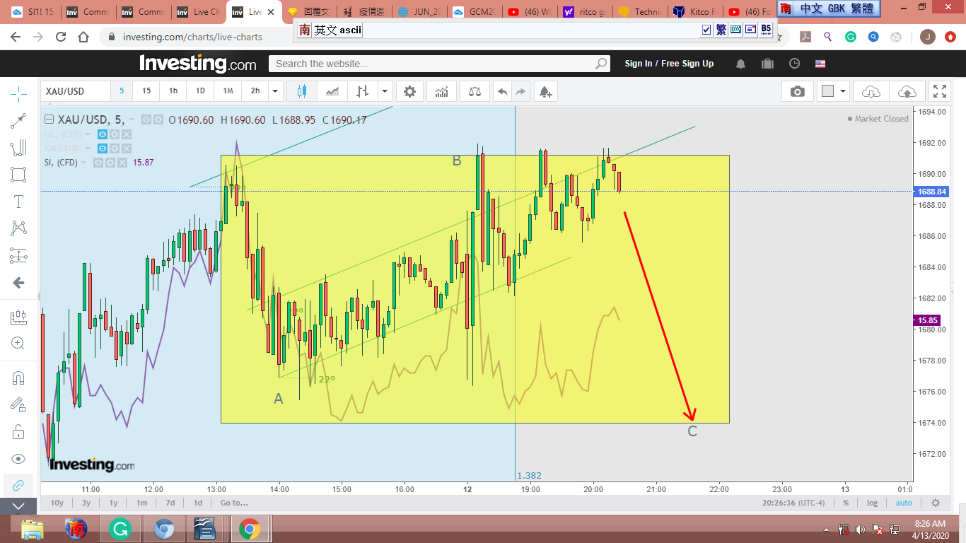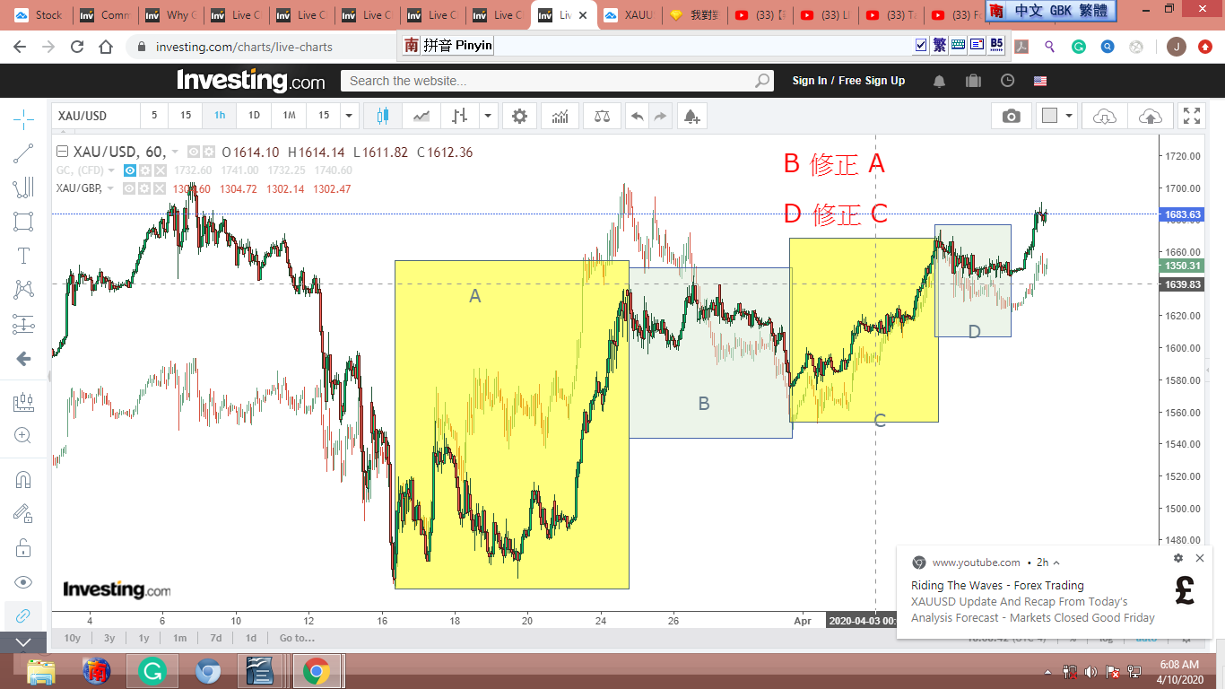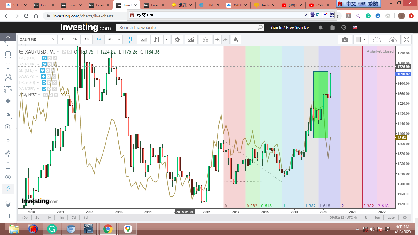 從去年9月起,世界動亂不已,金價受衝擊,圖形扭曲變形,零亂不堪。我參考反應較慢的金股,覺得從9-10-2018到3-13-2020,金子走完了一個完整的12345-ABC衝刺/修正波。[我只貼出一張圖,有興趣的可以拿各種金股或黃金共同基金多加對照。]