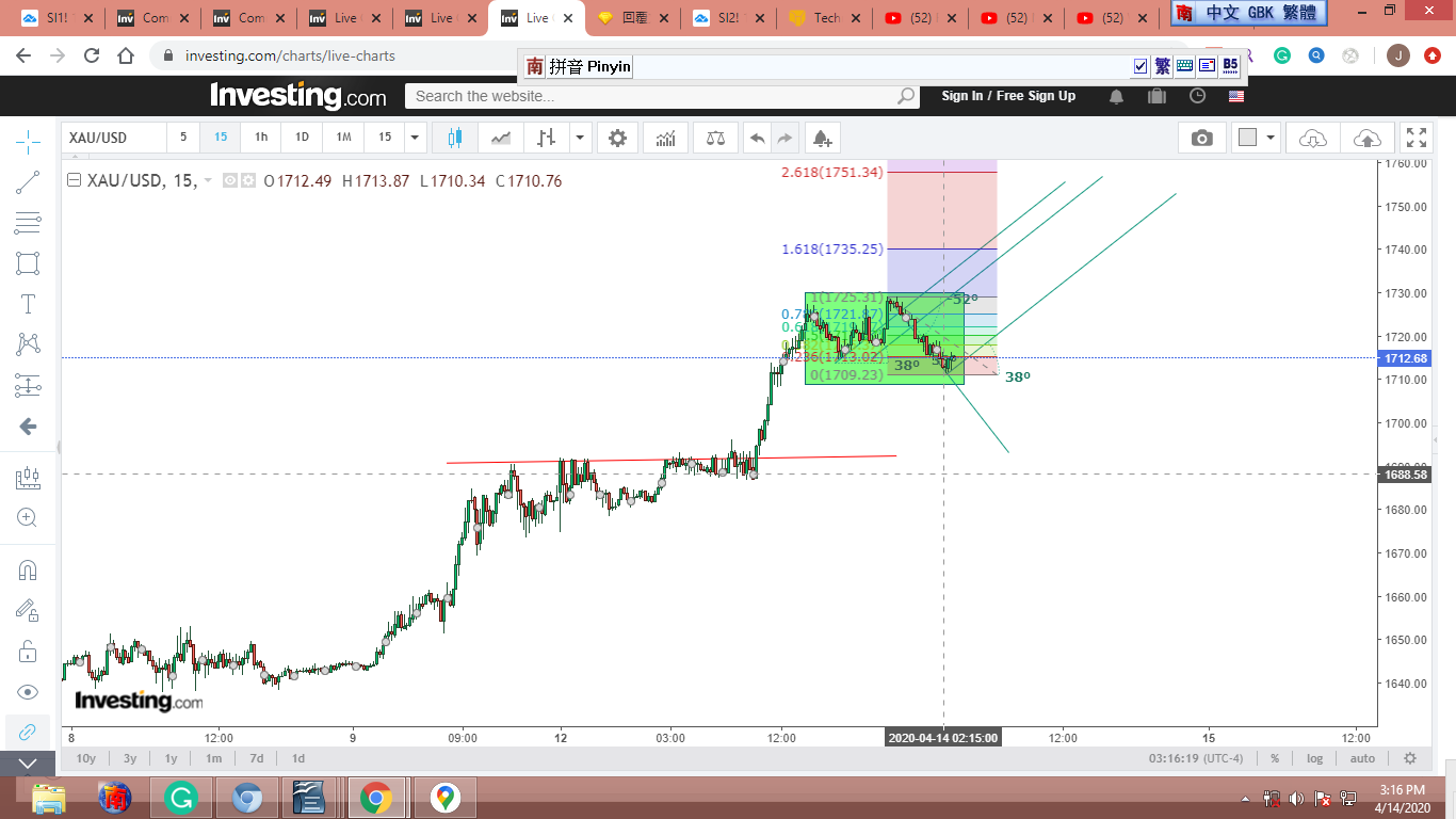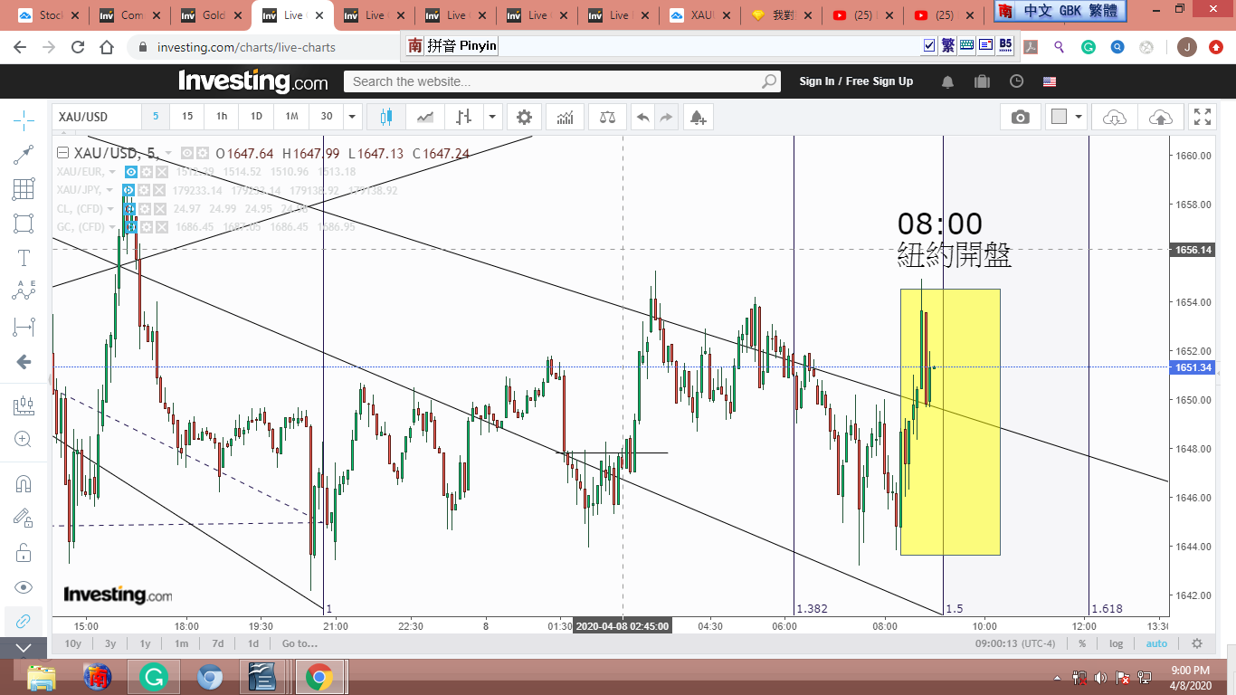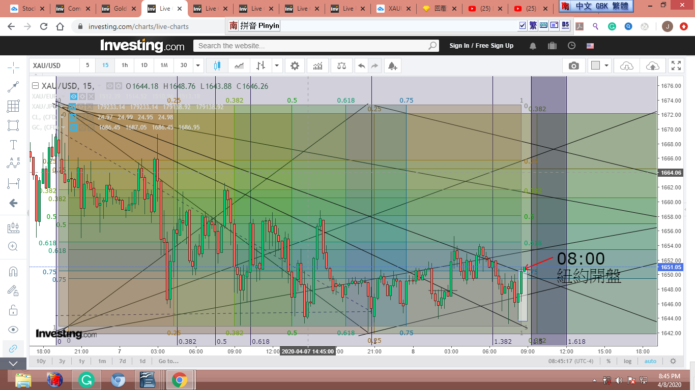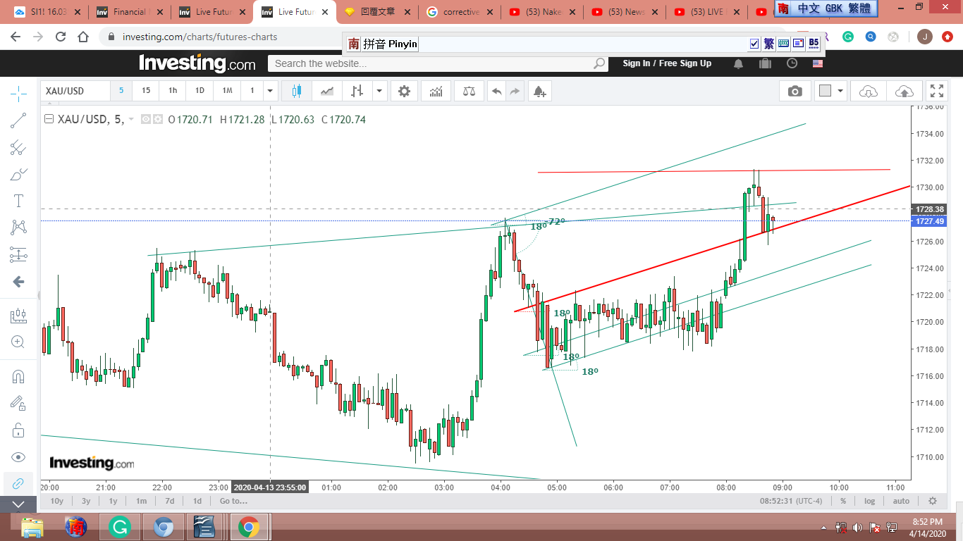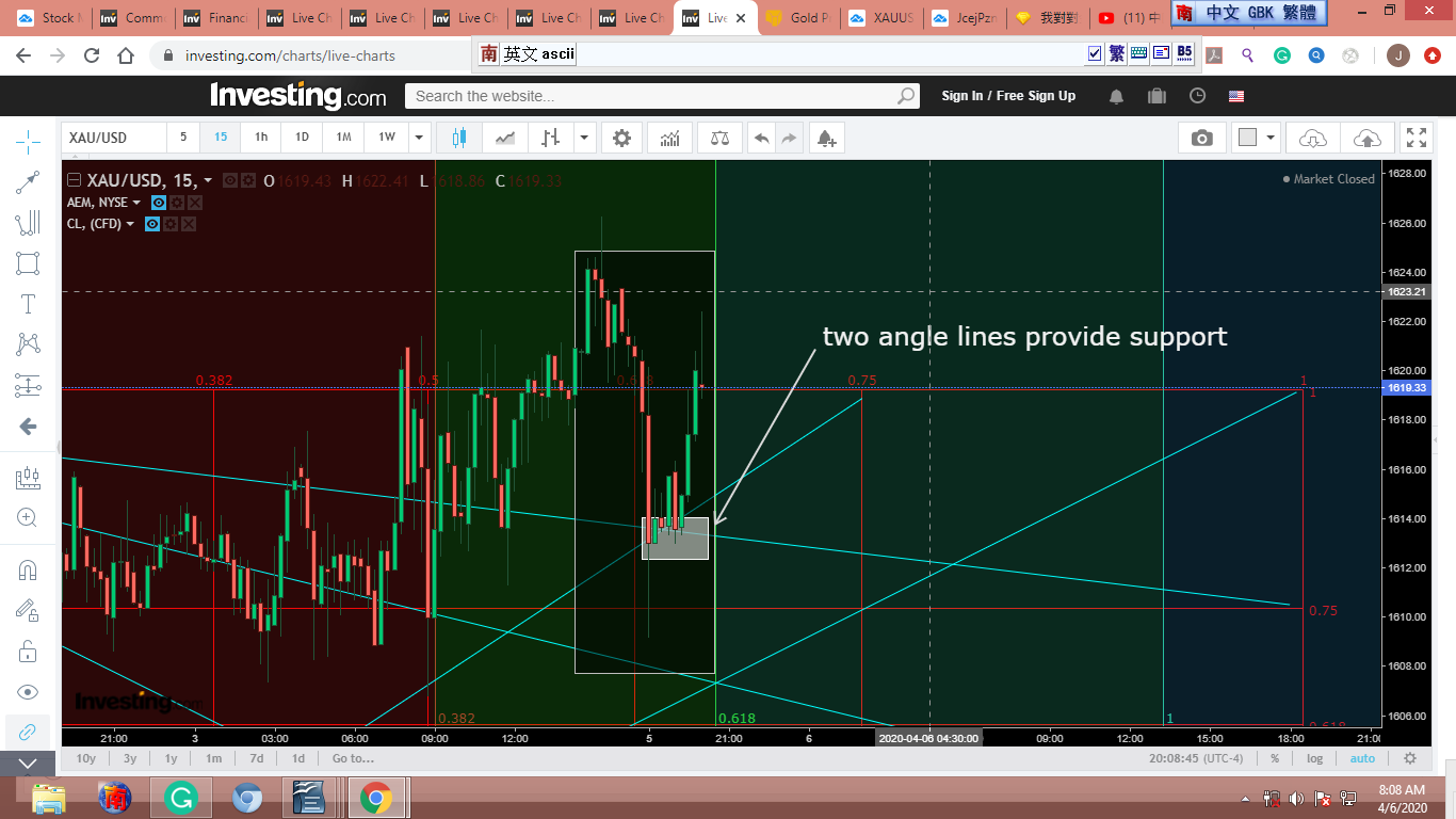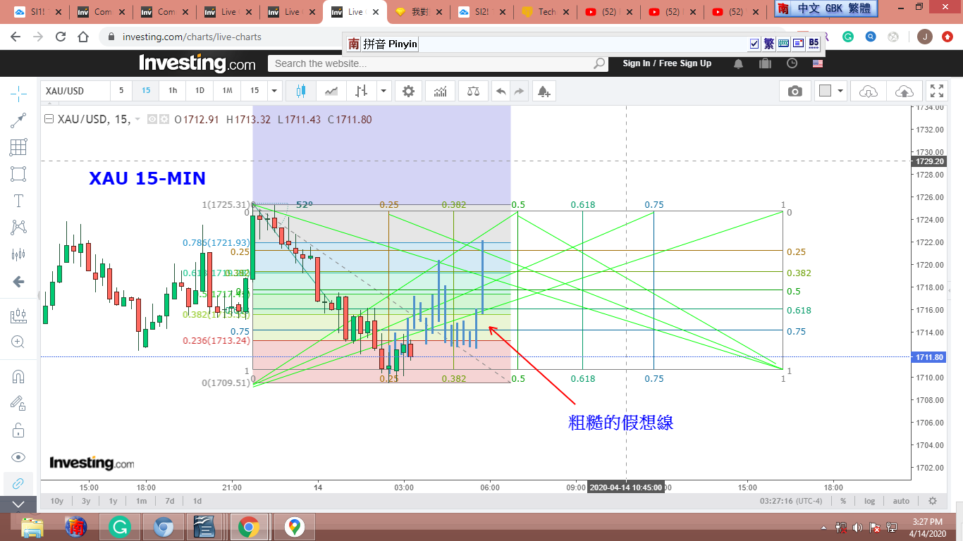 圖 4 做粗淺的Gann lines 分析,判斷在紐約開盤前,金價可能小幅下跌。可能會到綠框的上沿。