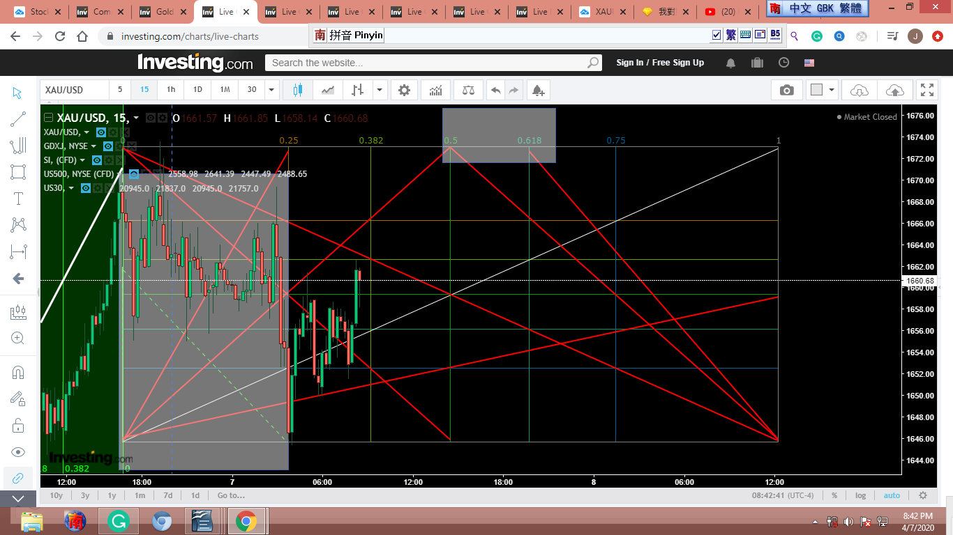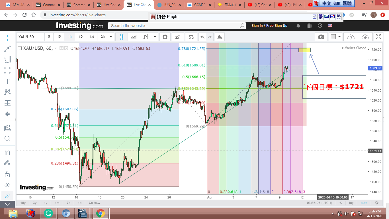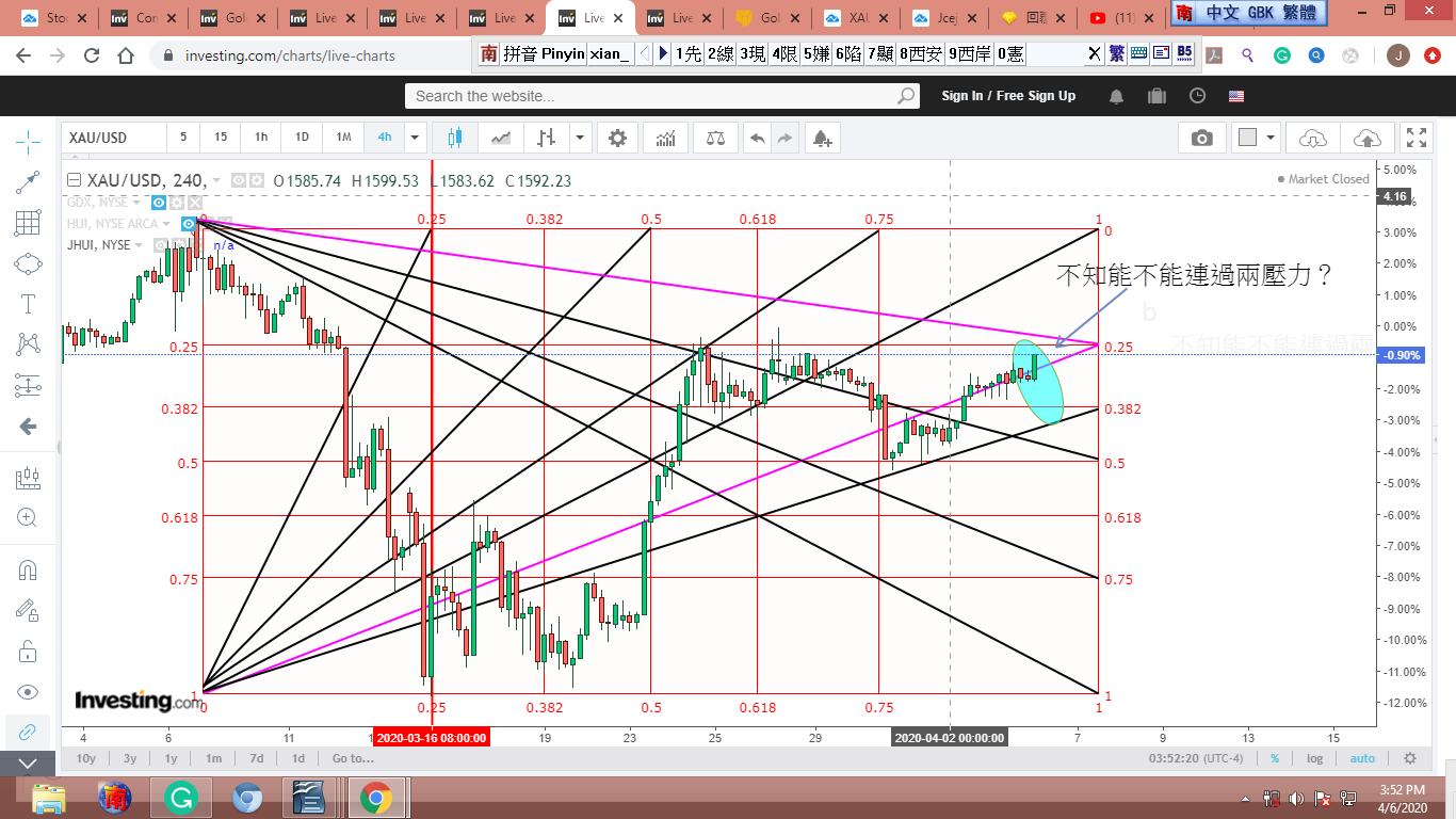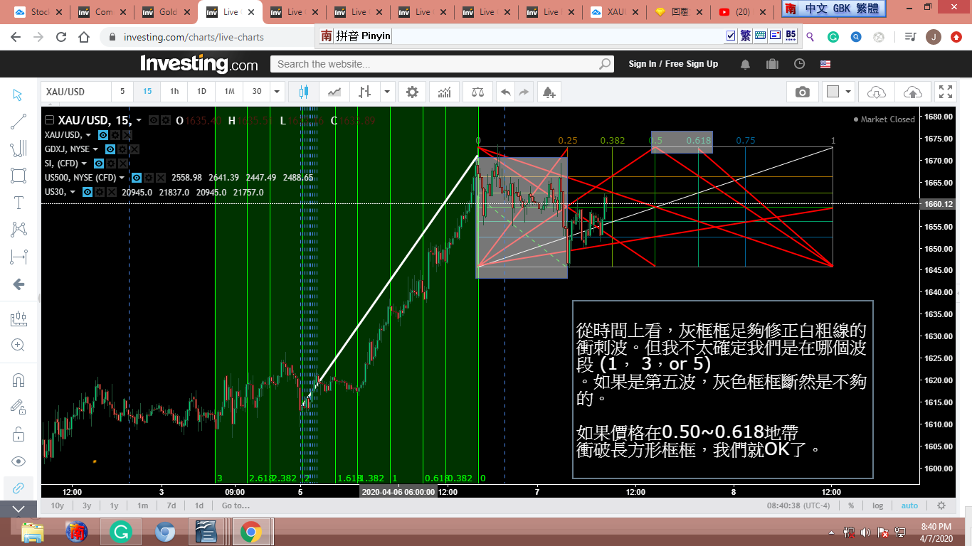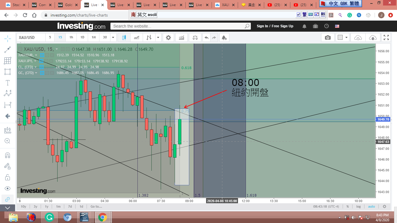 圖 4 做粗淺的Gann lines 分析,判斷在紐約開盤前,金價可能小幅下跌。可能會到綠框的上沿。