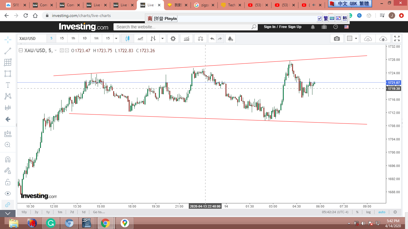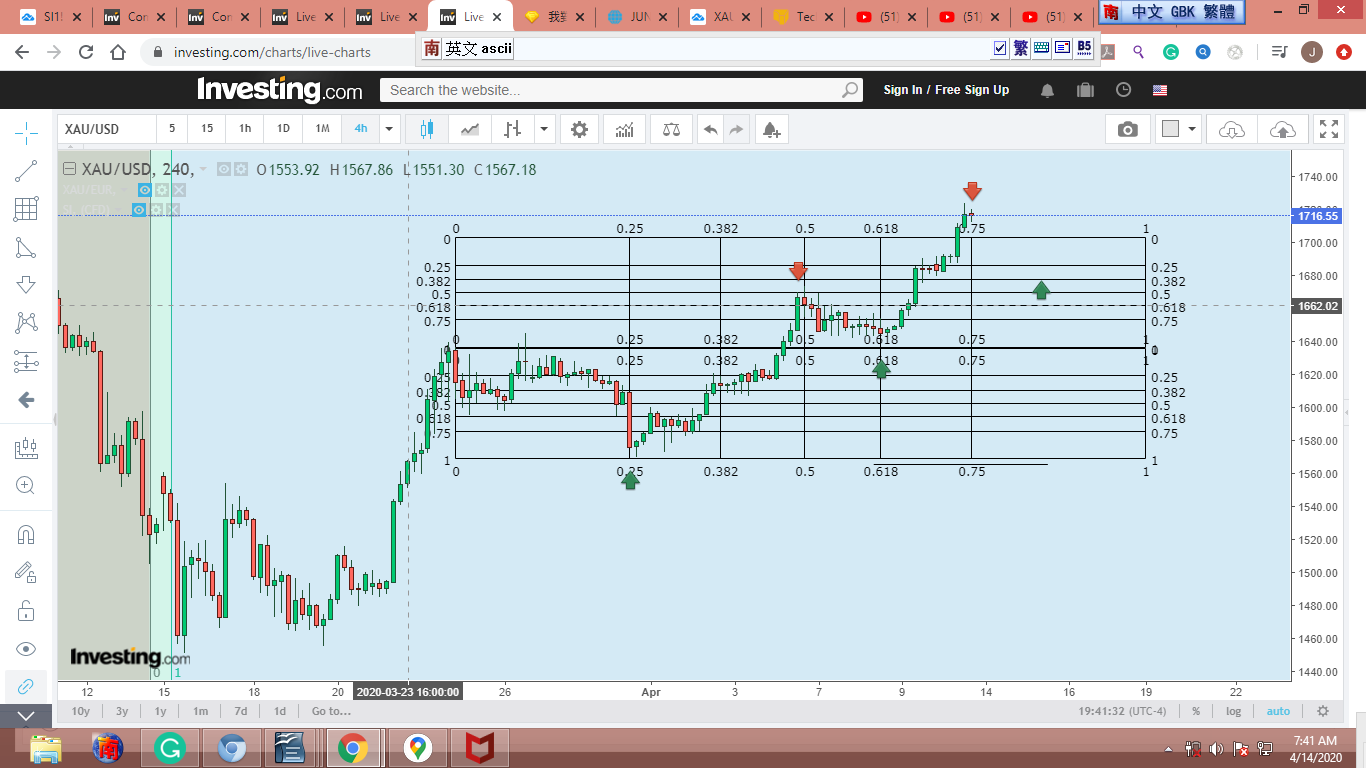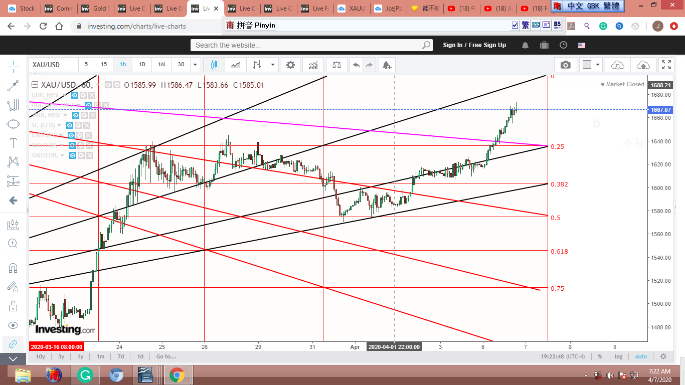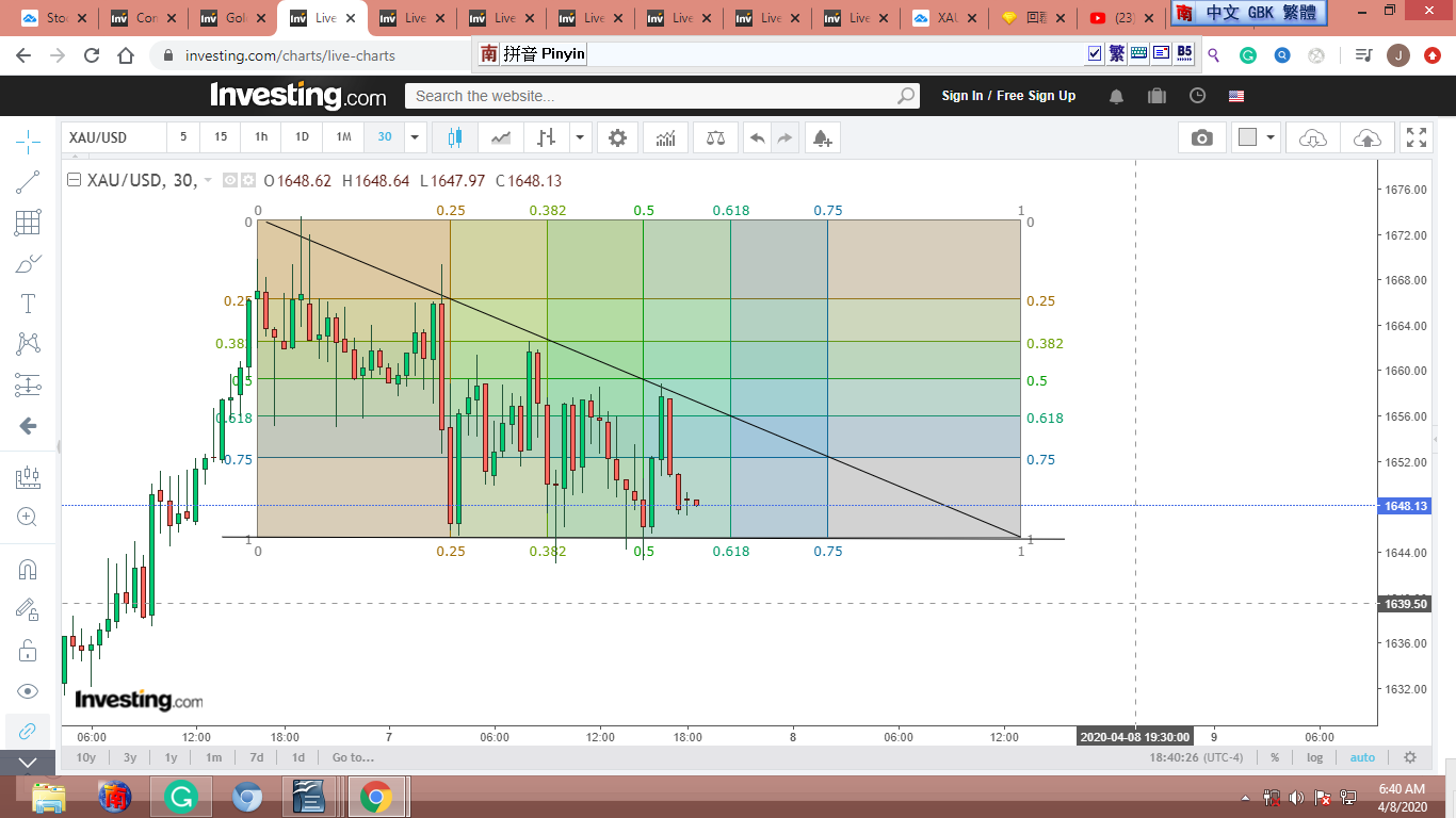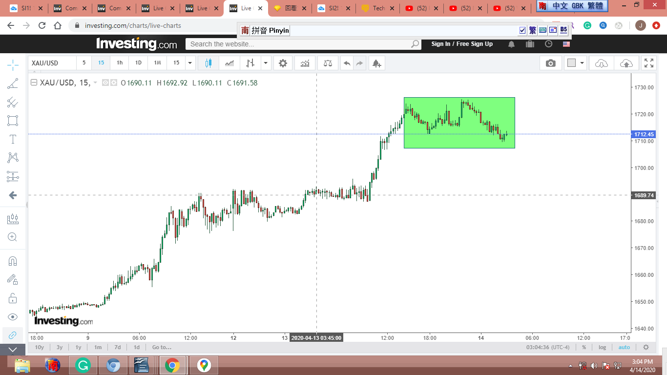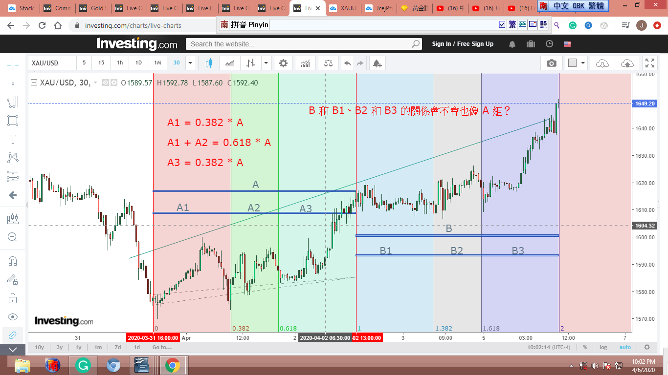 圖 4 做粗淺的Gann lines 分析,判斷在紐約開盤前,金價可能小幅下跌。可能會到綠框的上沿。