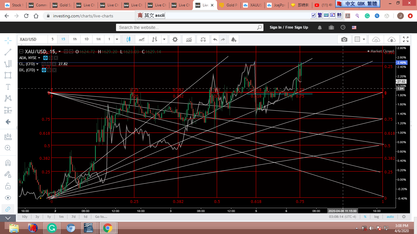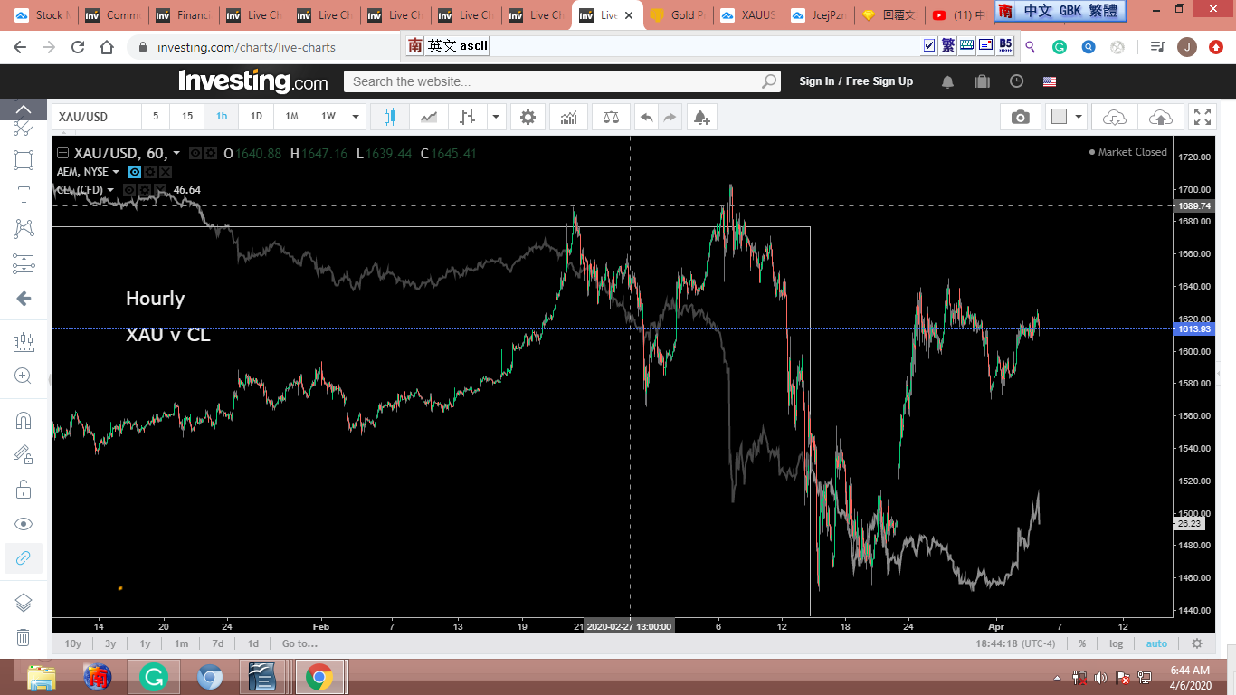 圖(1)是昨晚10左右的黃金圖。我當時希望黃金能加把勁,從灰色地帶衝出Gann Aquares,繼續向北前進。但下斜對角線壓力實在太強,黃金始終不能突破(見圖 2)。圖 2 看來嚇人,讓我想起Rule of Four。但我認為金子在走ABC 或 ABCDE,這可以從XAU/GBP (圖 3)看出。我曾說,黃金和原油最近同步進退。圖4 是XAU 和 德州原油對照圖,可以看出原油已經完成這一波的修正。