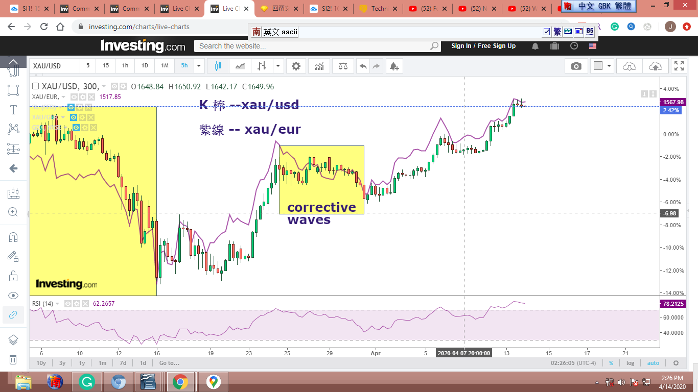 圖 2是 xau/usd 對 xau/eur,顯示的是圖 (1) 黃框框後的價格。圖中我認出一個 corrective waves,以黃框框標出。這點很重要,因為如果這個假設成立,那麼接下來的應該是個 motive waves。