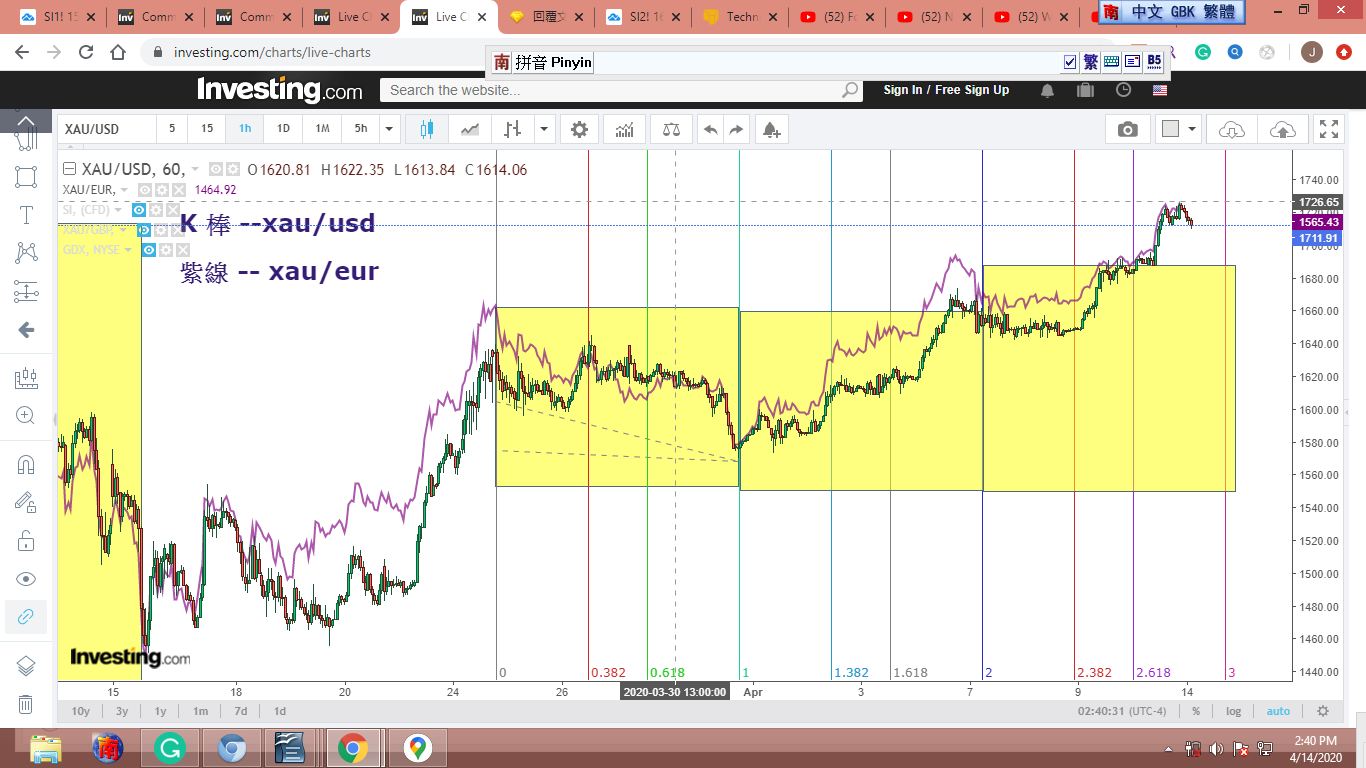 圖(1)是金子對白銀,我從白銀線圖推斷淡藍框是 motive waves,而黃框是 corrective waves。我從兩個框框的時間推斷這是個完整波,接下來是一個新波段的開始。