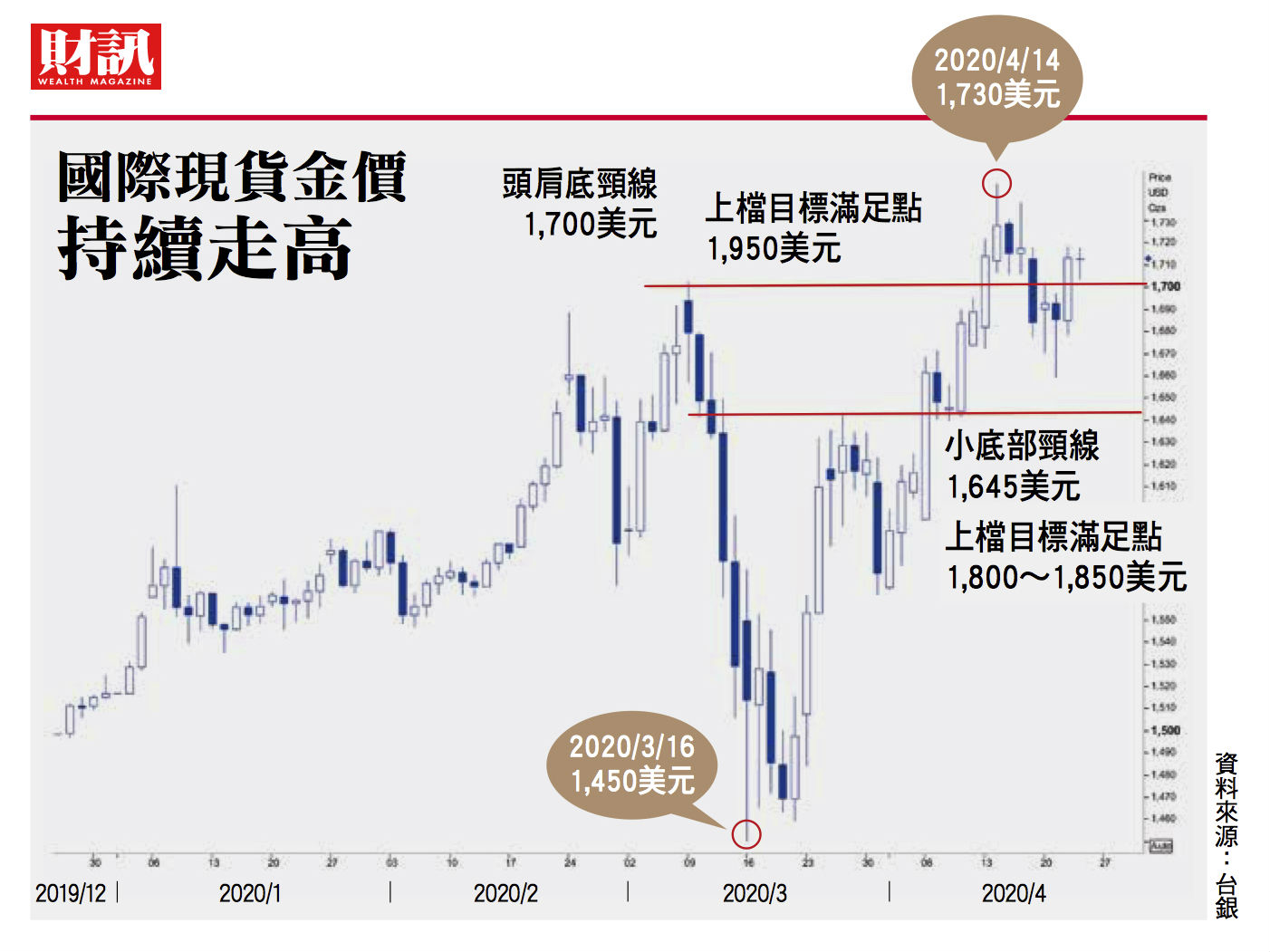 目前金價下面頸線在1645美元的小底部已經確實形成,目標價位大約在1830美元;若是1700美元站穩,且收盤價有效把這波高價1736美元突破,代表大頭肩底底部形成,就線論線,目標就是1950美元。如此一來,也代表金價就創新高了,現貨金價的歷史高點是2011年9月時的1922美元。