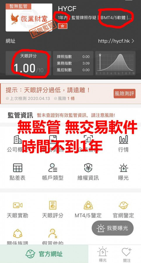 經外匯天眼APP查詢,恆業財富是一家沒有任何監管,公司成立時間不到一年,不使用外匯交易軟件的黑平台,天眼評分為1.0分,請大家遠離!