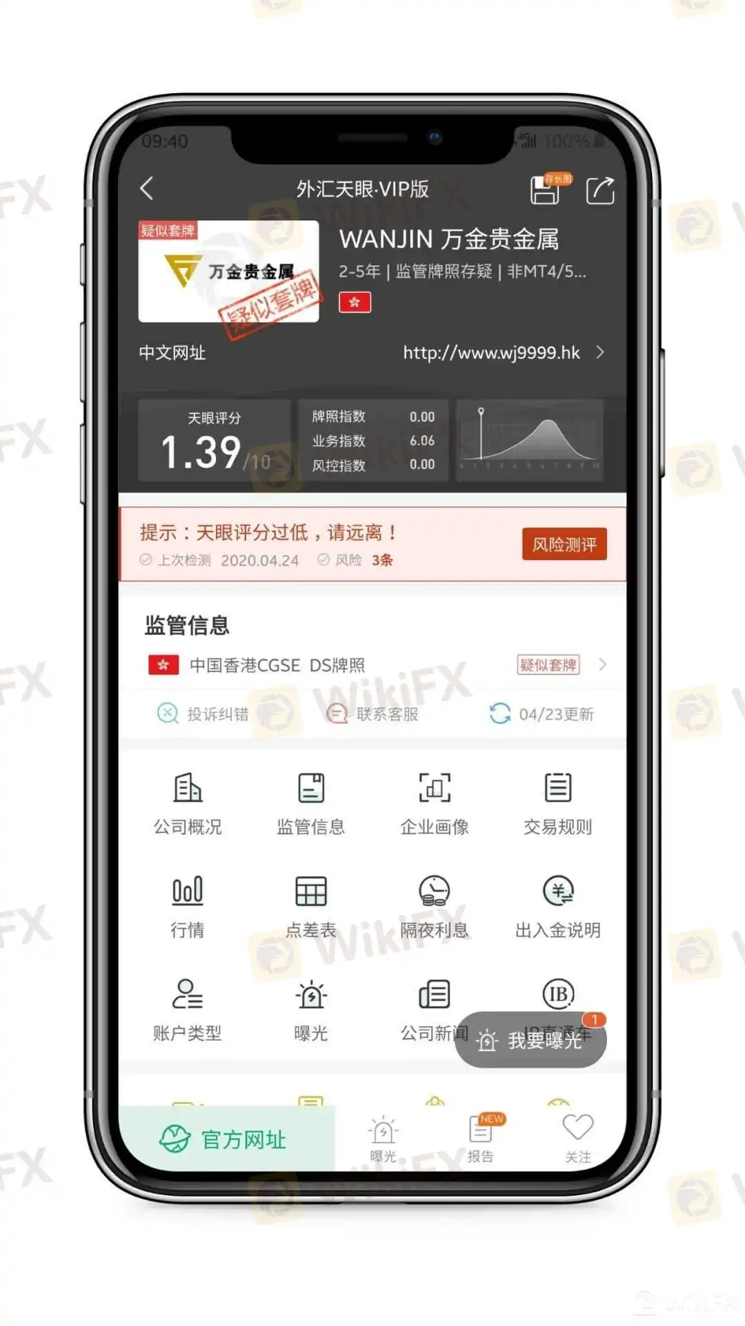 WANJIN萬金貴金屬,天眼評分1.39分,其所持牌照疑似套牌,且該交易商使用的交易軟體非MT4/5,該類軟體安全性存疑,存在巨大風險,建議遠離。