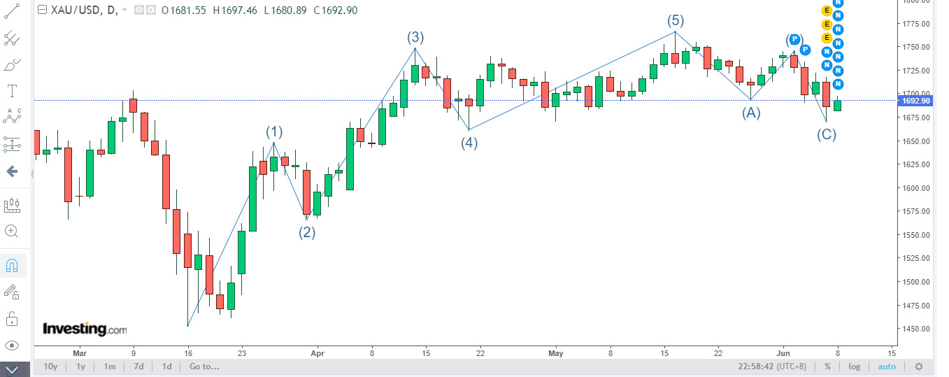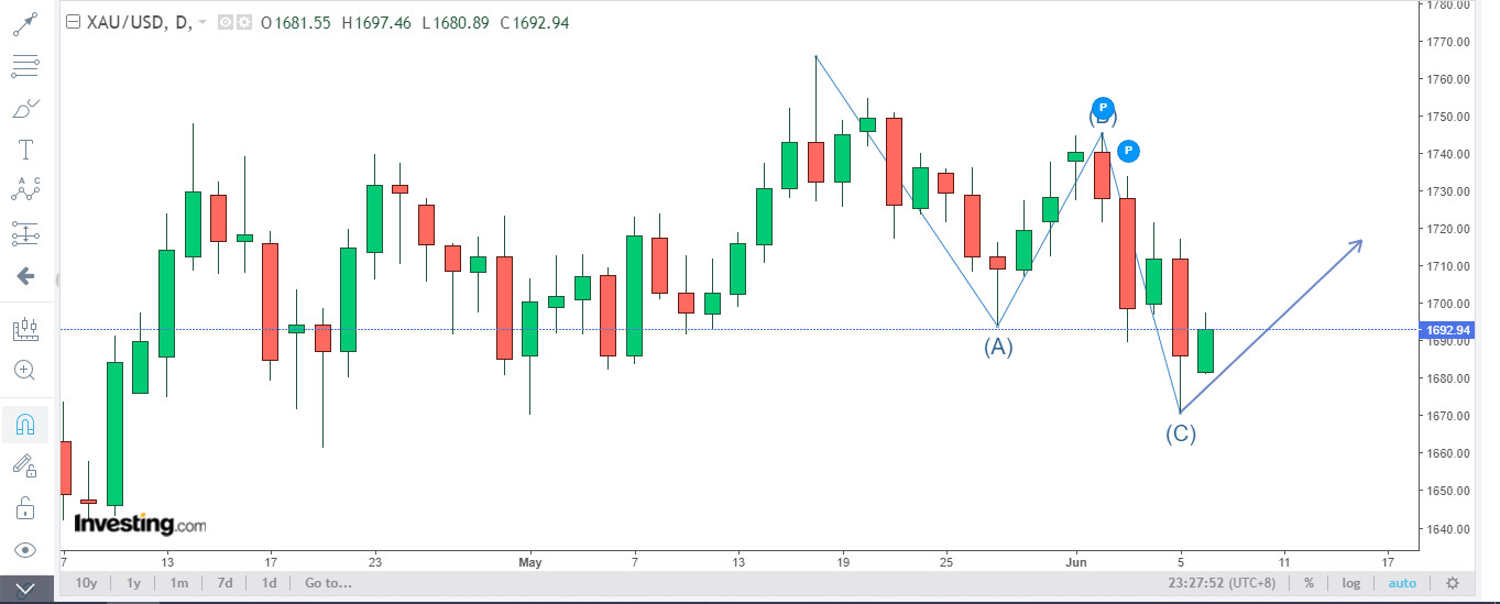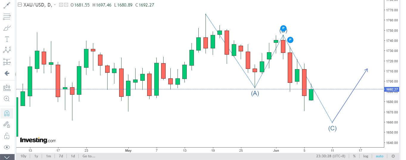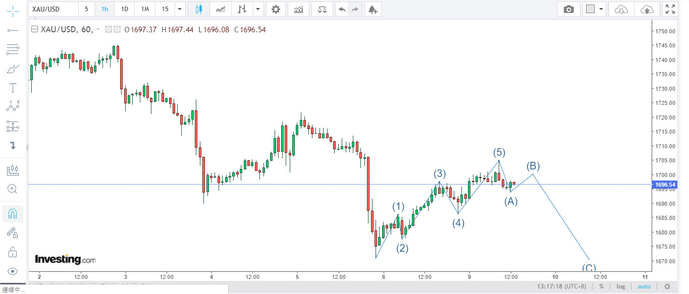 劇本二、繼續反覆向上至大約1695-1700,然後下探約1656-1660(第三注買入時機),屆時應會有不少黃金負面新聞與很多不堅定散戶失望情緒表現,之後金價就會反升,報復式的反升