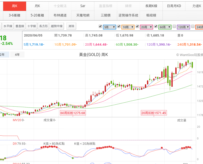 所以要推動牛移動第一步一定要三KD同時落底一起翻揚(黃金也是),第二步以後一定是二KD(日週)同時落底(黃金也是),那月KD在幹嘛?月主要是控制前進目標的頭,所以動一下就可以(也就是製造背離的假像,這假像通常都會越接近歷史高點,越容意出現也就是小心),直到走完行情月線才會正式告跌。