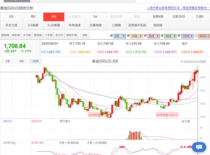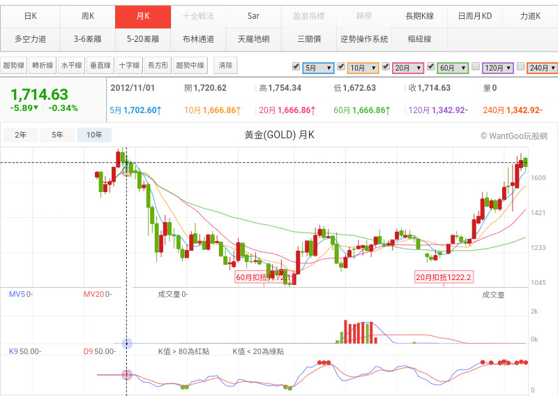 金價急走,帶動60月均線變動???這個問題的真相關係到「黃金能走多遠的旅程?」什麼能影响黃金未來的「價格」呢?只有「烽火連天黃金萬兩,天下太平之時,黃金視如糞土」,所以黃金急走是否是意味天下之亂不會太久(60/120月均線已經悄悄地說明了)。